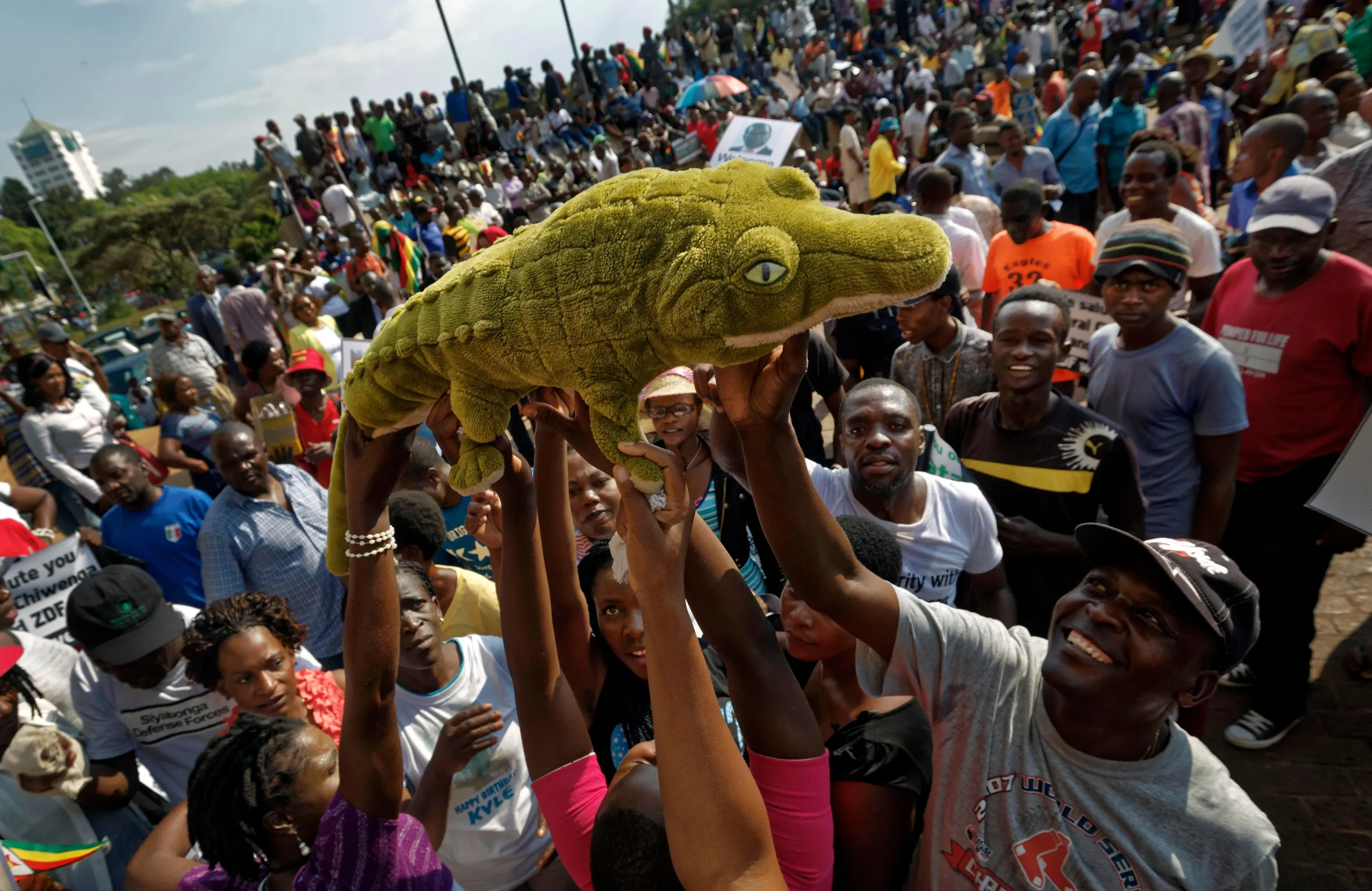 Supporters of Zimbabwe's President in waiting Emmerson Mnangagwa, known as “The Crocodile”, raise a stuffed crocodile in the air as they await his arrival at the Zanu-PF party headquarters in Harare, Zimbabwe Wednesday, November 22, 2017. Mnangagwa has emerged from hiding and returned home ahead of his swearing-in Friday. Crowds have gathered at the ruling party's headquarters for his first public remarks. Mnangagwa will replace Robert Mugabe, who resigned after 37 years in power when the military and ruling party turned on him for firing Mnangagwa and positioning his wife to take power. (Photo by Ben Curtis/AP Photo)