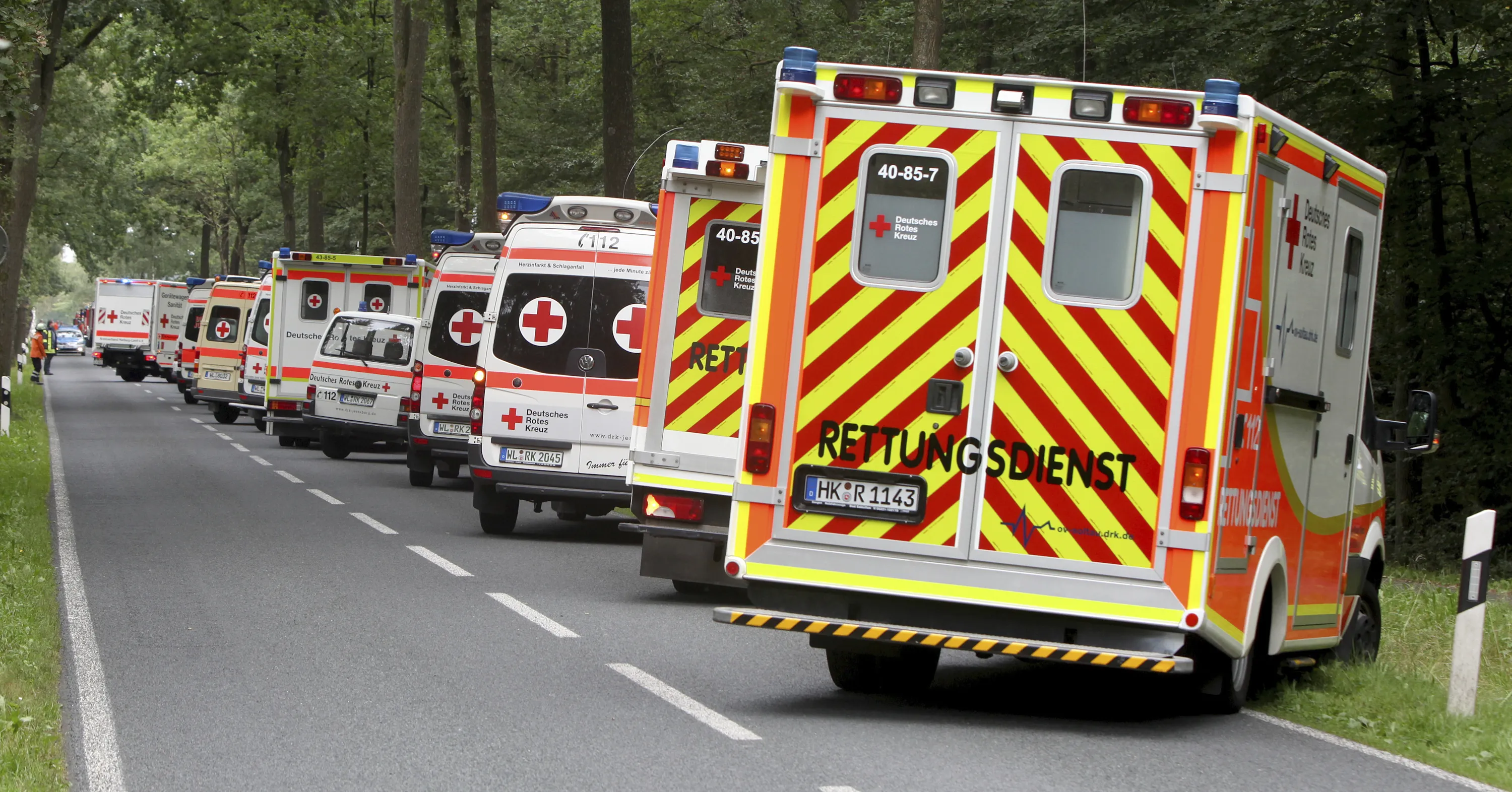 In this September 4, 2015 file photo ambulances stand at a road in Handeloh, Germany. A German psychotherapist has been sentenced to probation after to confessing to providing a group of alternative practitioners psychedelic drugs as part of a seminar on expanding consciousness as a form of therapy Wednesday, November 22, 2017. The 2015 seminar resulted in the hospitalization of the 27 participants with cramps, delirium and other complications from ingesting the psychadelic drug 2C-E and also the extremely potent hallucinogen known as DragonFLY in the northwestern town of Handeloh. (Photo by Christian Butt/DPA via AP Photo)
