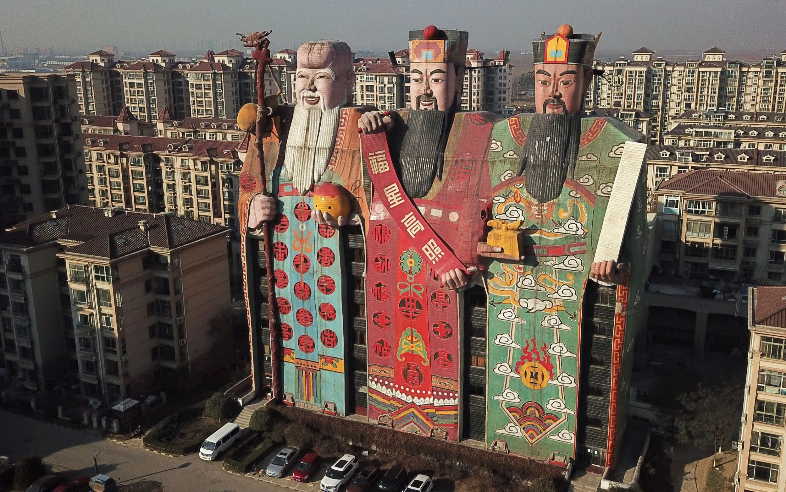 The Tianzi Hotel with the shape of Chinese deities Fu, Lu and Shou is pictured on November 20, 2017 in Langfang, Hebei Province of China. The 41.6-meter-tall Tianzi Hotel has an exterior of Chinese Sanxing, whose names are Fu, Lu and Shou with the qualities of prosperity, status and longevity in traditional Chinese culture, in Langfang city. (Photo by VCG/VCG via Getty Images)