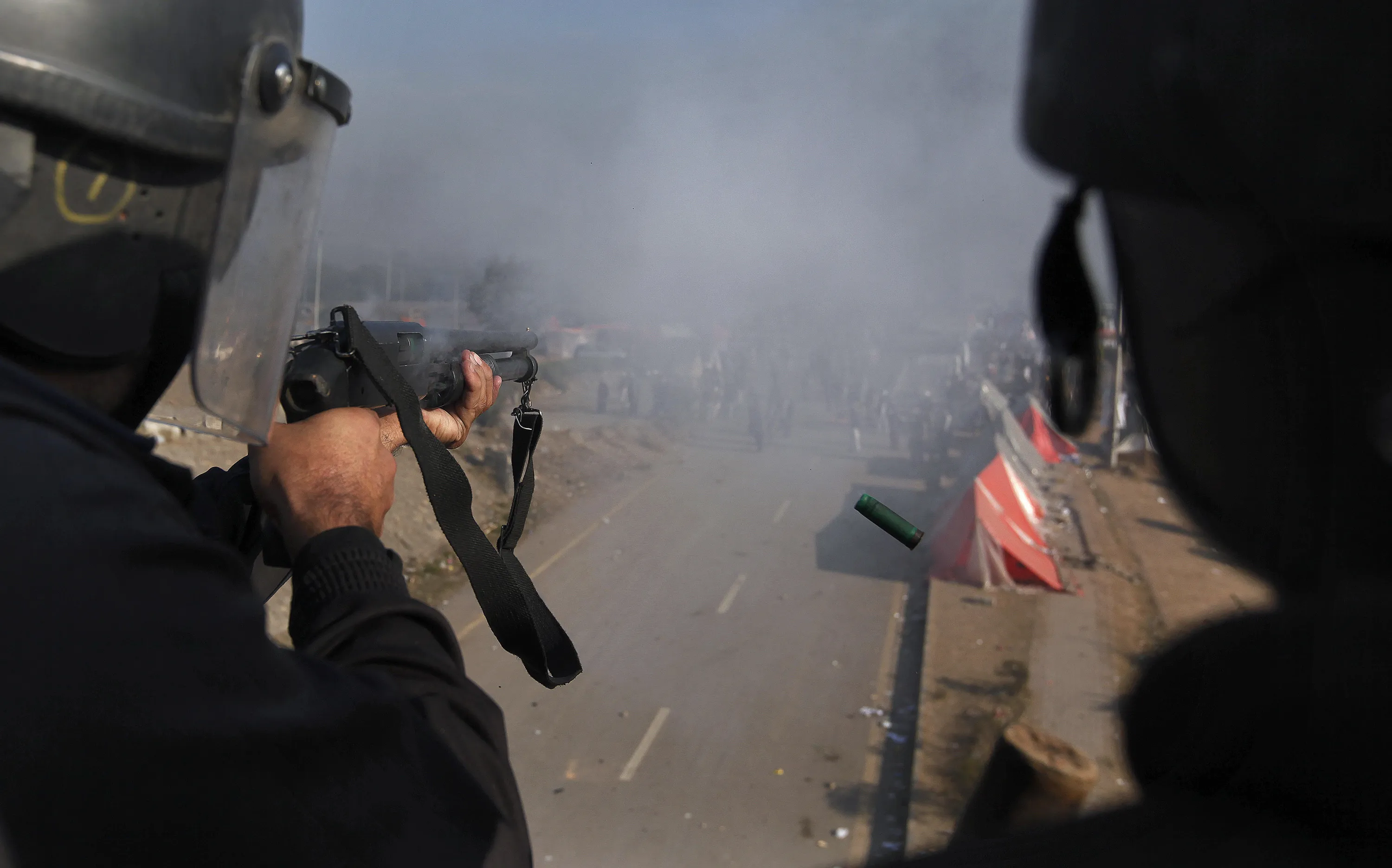 A Pakistani police officer fires rubber bullets to disperse protesters during a clash in Islamabad, Pakistan, Saturday, November 25, 2017. Police launched an operation to clear an intersection linking the Pakistani capital Islamabad with the garrison city of Rawalpindi where an Islamist group's supporters camped out for the last 20 days, officials said Saturday. (Photo by Anjum Naveed/AP Photo)