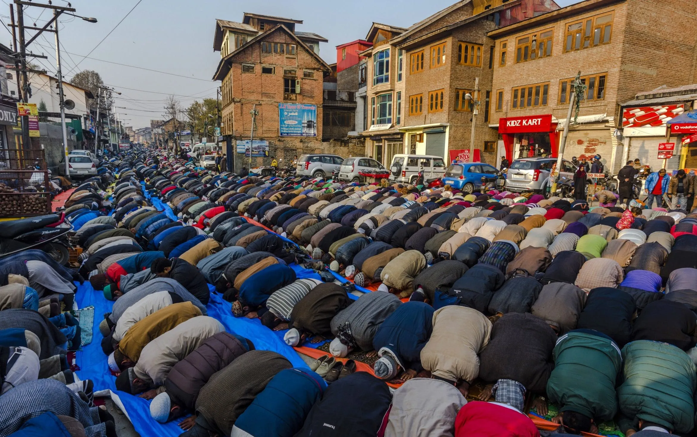 Kashmiri Muslims offer prayers outside the shrine of Khwaja Naqshband on November 22, 2017 in Srinagar, the summer capital of Indian administered Kashmir, India. Thousands of devotees from across Kashmir converge at the shrine of Khwaja Naqshband Sahib in downtown Srinagar to participate in annual congregational prayers called “Khoja Digar” on the 3rd of Rabi-ul-Awal, the third month of the Islamic calendar. (Photo by Yawar Nazir/Getty Images)