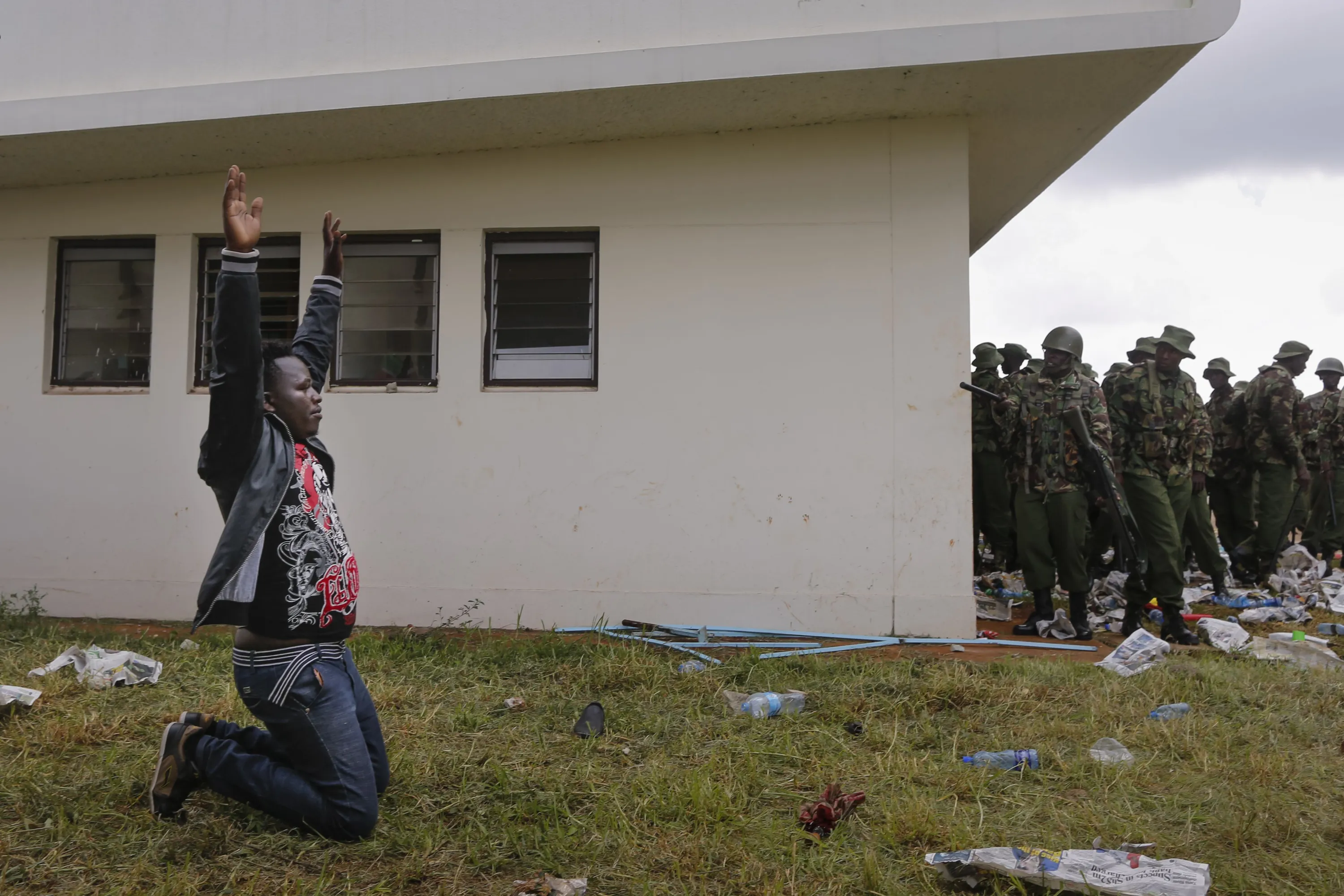 A man kneels down as he and others face off against police officers after they tried to force their way into the stadium where President-elect Uhuru Kenyatta is about to arrive for his swearing-in ceremony in Nairobi, Kenya, 28 November 2017. Outside of the stadium, police fired tear gas to disperse the crowd who tried to force their way into the venue while Kenyatta and his deputy William Ruto were being sworn-in as President and deputy president respectively at an event attended by several African heads of states. Supporters of the opposition coalition the National Super Alliance and its presidential candidate Raila Odinga also clashed with police as they try to hold a rally in the capital. Local media reported at least three people have been shot as protesters engaged in running battles with police.