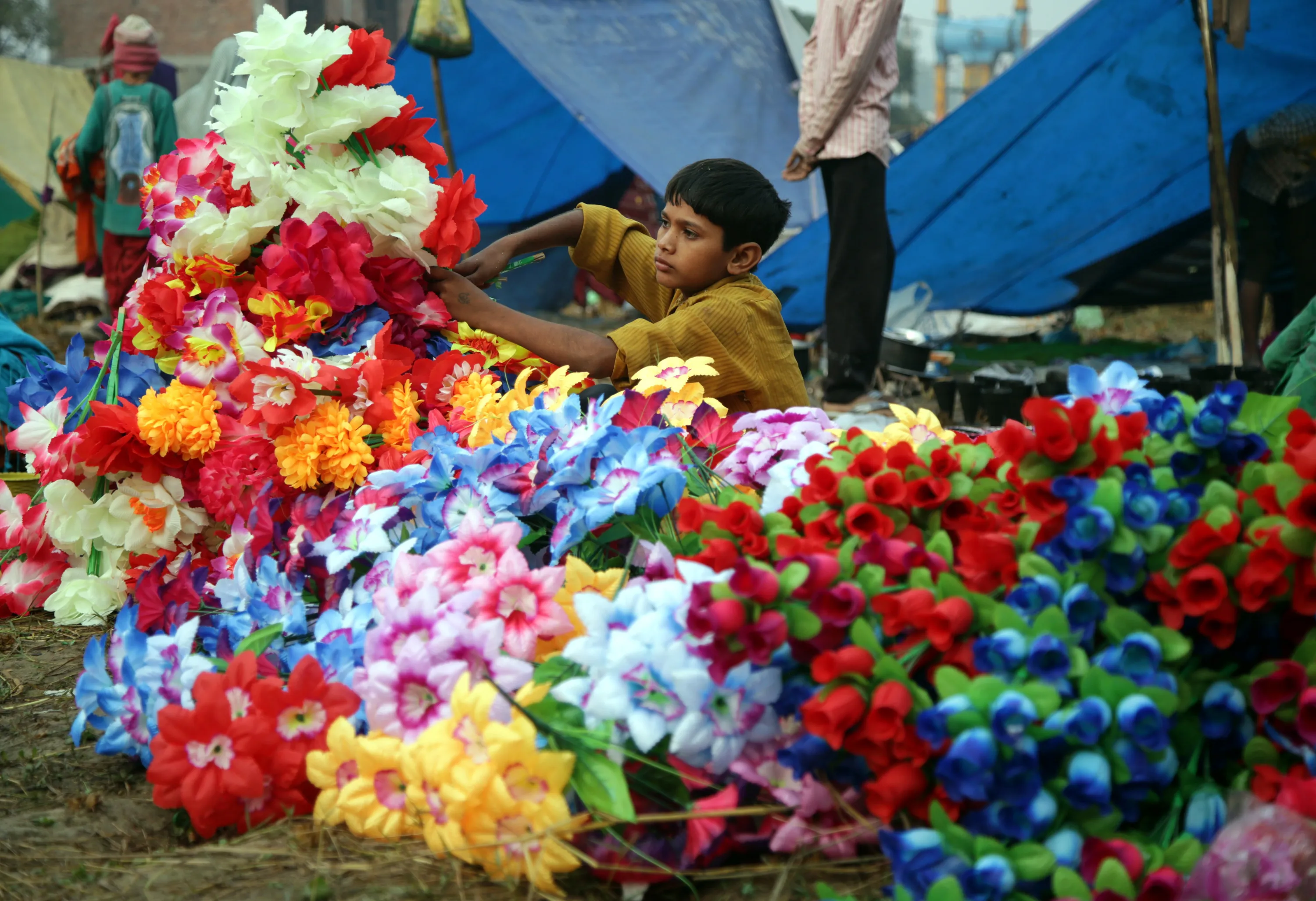 An Indian boy prepares the bunches of artificial flowers for sale during the annual Farmers Fair at Shama Chak Jhiri, some 22 km from Jammu, the winter capital of Kashmir, India, 03 November 2017. Every year hundreds of vendors from Punjab, Haryana, Rajasthan and Utter Pradesh come to farmers fair to setup their business in a week-long fair. Farmers in huge numbers from all over India gather to pay tribute to the Samadhi or tomb of legendary farmer Baba Jit Mal, popularly known as Baba Jitto who sacrificed his life for the liberation of the farming community. (Photo by Jaipal Singh/EPA/EFE)