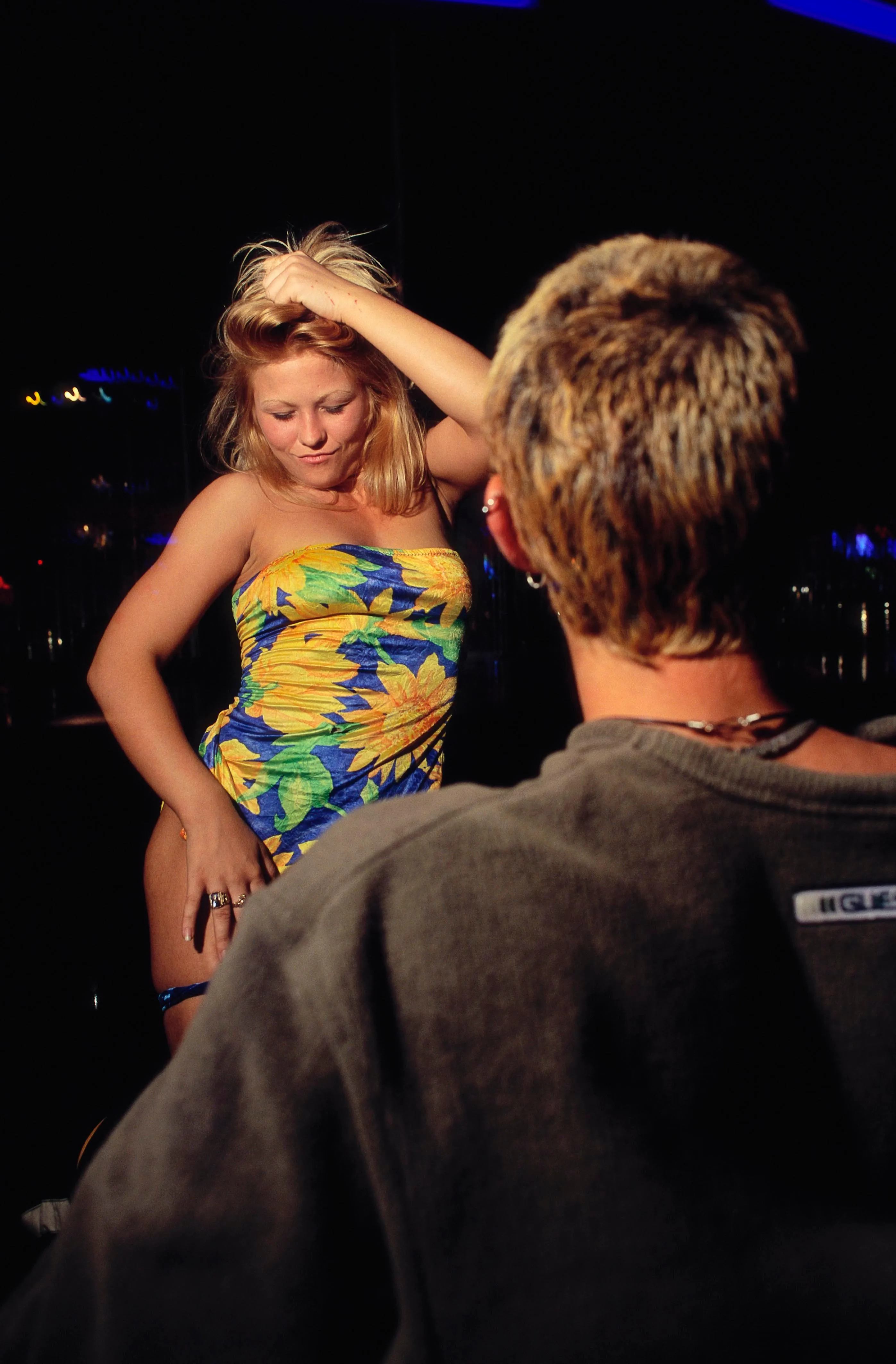 A stripper dances on stage in front of a young male customer at the Gentlemen's Club. (Photo by Mark Peterson/Corbis via Getty Images)