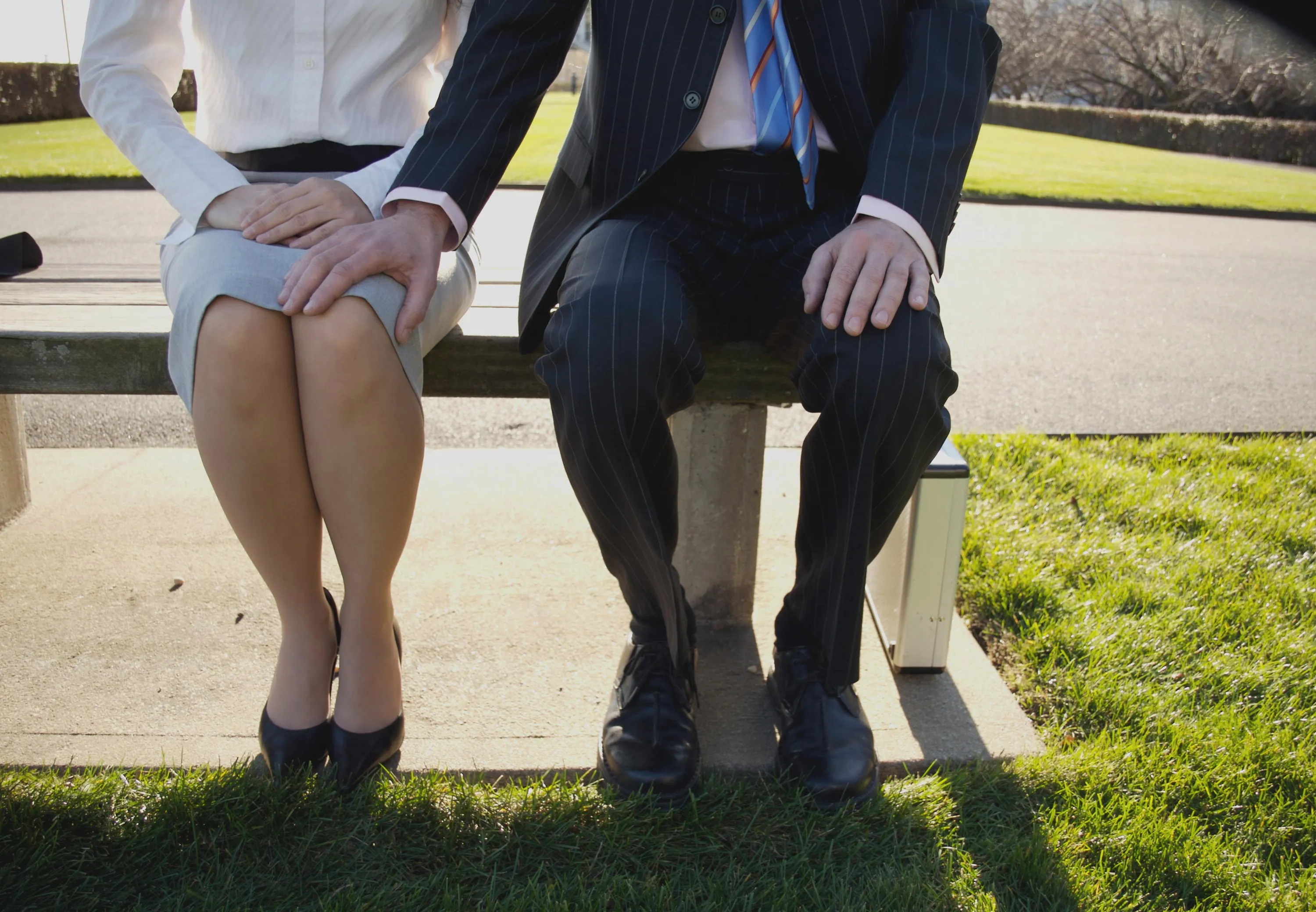 Man and woman sitting on a park bench, hand On knee. (Photo by Sampatrickstock/Getty Images)