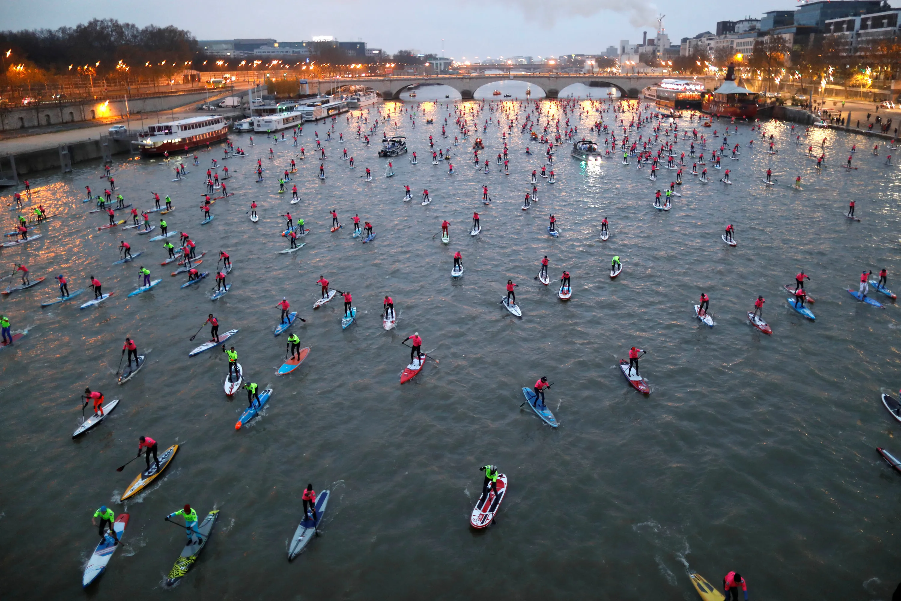 Amateurs and professionals take part in the Nautic Sup Paris crossing stand up paddle race along the Seine River in Paris on December 3, 2017. (Photo by Charles Platiau/Reuters)