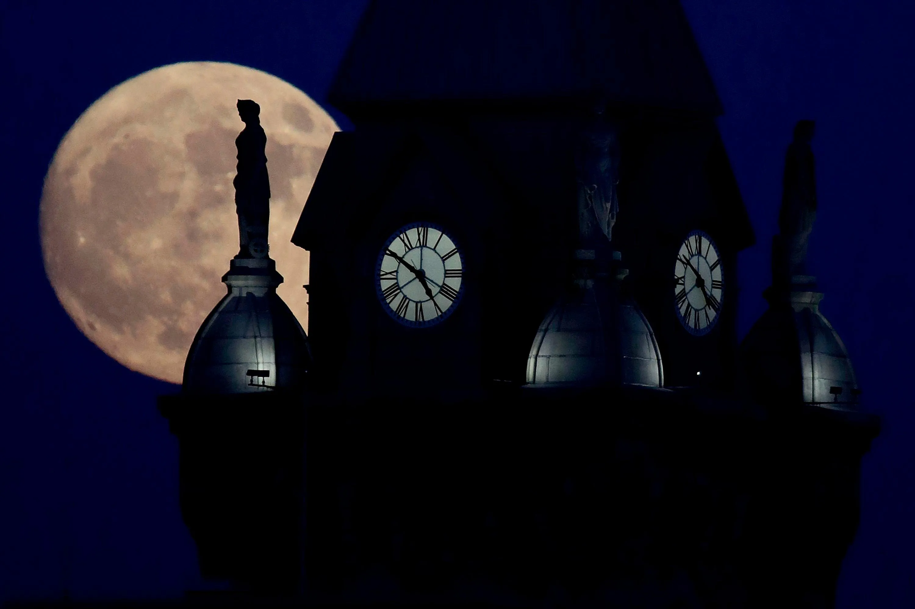 The moon rises in its waxing gibbous stage behind a statue atop the Erie County Court Building, Saturday, December 2, 2017, in Buffalo, N.Y. The Dec. 3 full moon will be the first of three consecutive supermoons. The two will occur on Jan. 1 and Jan. 31, 2018. A supermoon is a full moon or a new moon that approximately coincides with the closest distance that the moon reaches to Earth in its elliptic orbit, resulting in a larger-than-usual apparent size of the lunar disk as seen from Earth. (Photo by Julio Cortez/AP Photo)