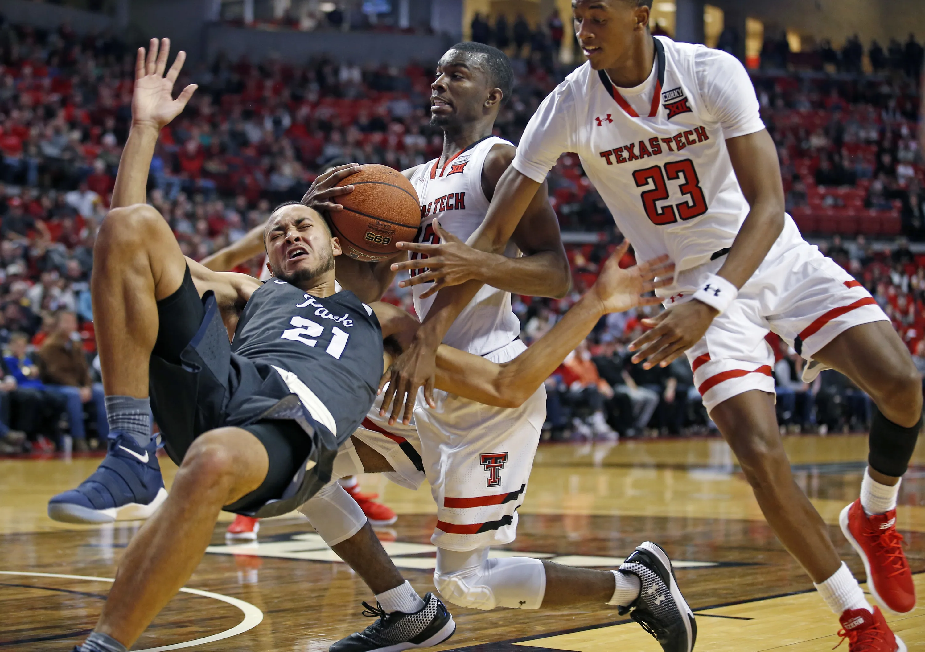 Texas Tech's Keenan Evans (12) and Jarrett Culver (23) defend Nevada's Kendall Stephens (21) during the second half of an NCAA college basketball Tuesday, December 5, 2017, in Lubbock, Texas. A defensive foul was called on the play. Texas Tech won 82-76 in overtime. (Photo by Brad Tollefson/AP Photo)