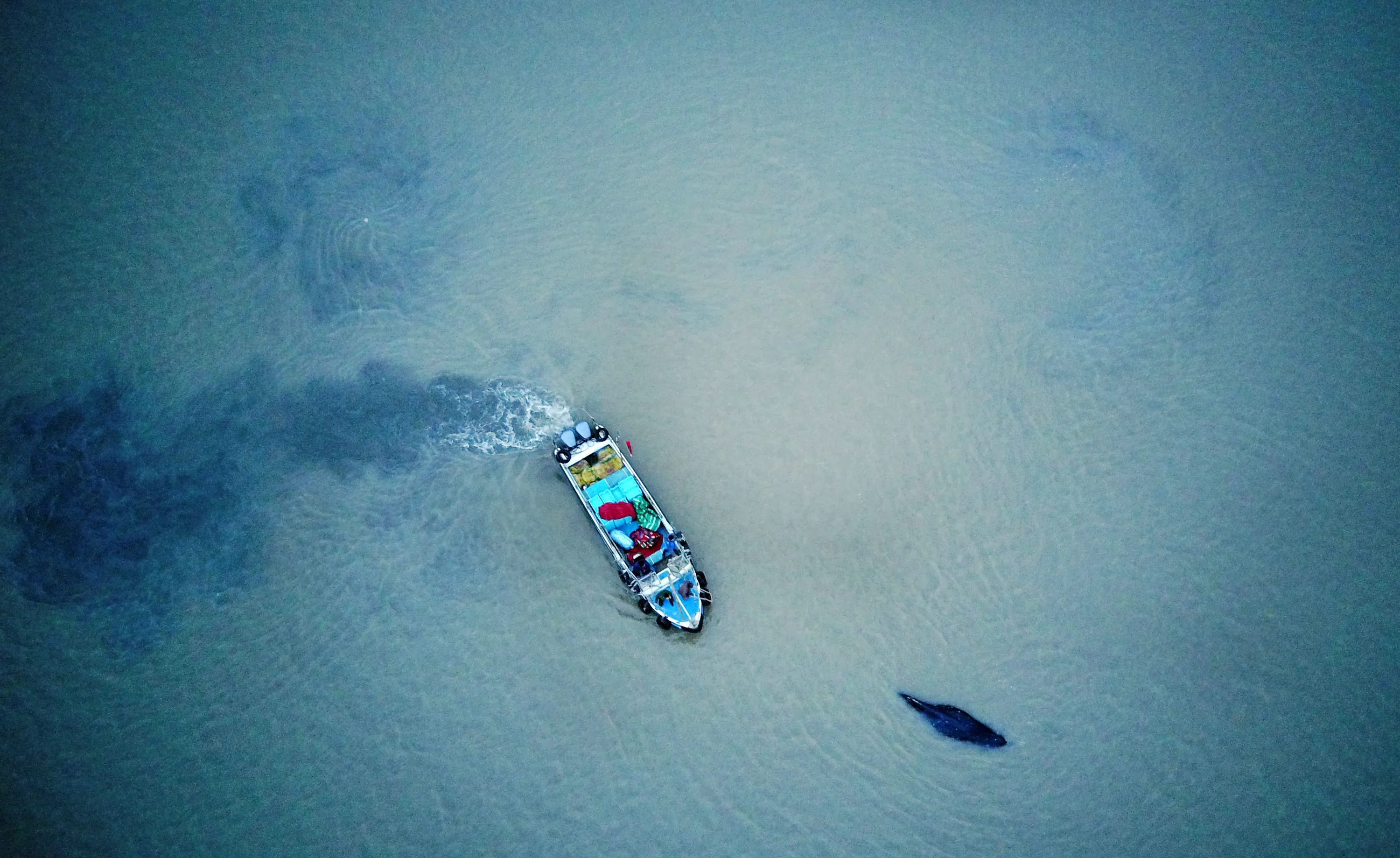 This photo taken on November 13, 2017 shows a boat escorting a stranded humpback whale back to deeper waters in Qidong in China's eastern Jiangsu province. (Photo by AFP Photo/Stringer)