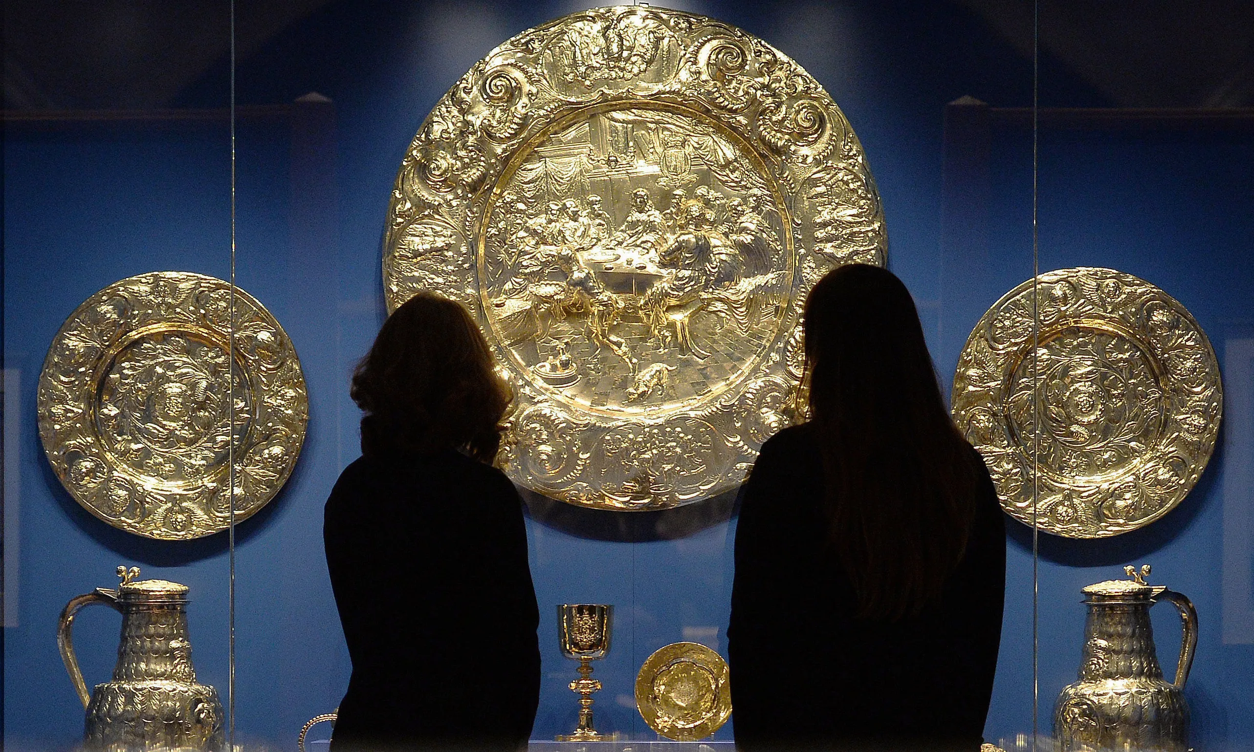 Two gallery assistants pose with a silver gilt altar dish (circa 1660) in The Queen's Gallery at Buckingham Palace on December 7, 2017 in London, England. The items are part of the new “Charles II: Art & Power” exhibition, which explores his use of art to reinforce his legitimacy and authority as monarch. The exhibition runs from 8 December 2017 to 12 May 2018. (Photo by John Stillwell/PA Wire)