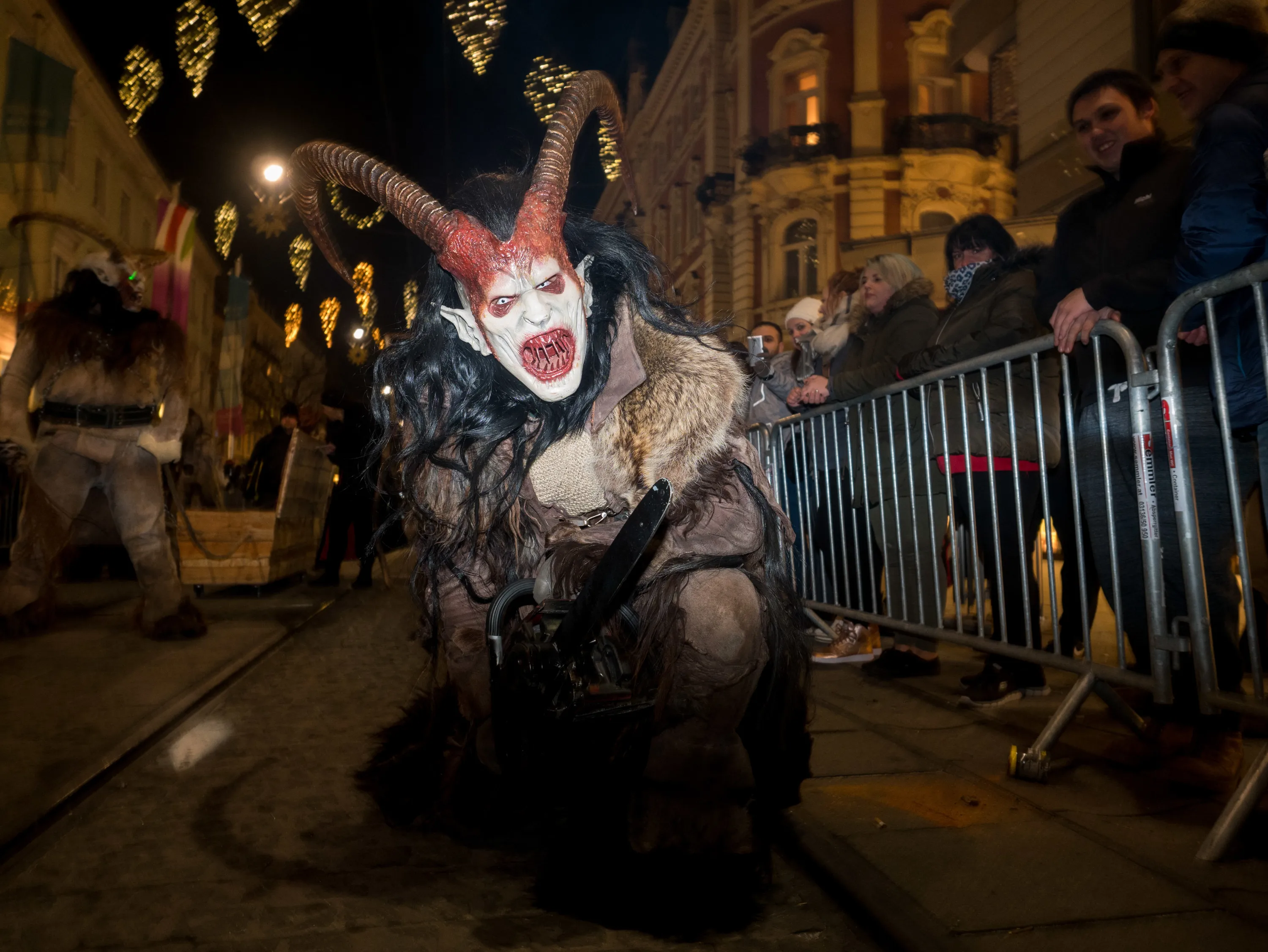 A devil character seen running in the centre of Graz, Austria on December 3, 2017. Around December 6th, St. Nicolas Day, people dress up as devils run through streets of towns and villages in Austria. They seem like if they jumped out from a horror movie. Or from the hell. They are dressed in animal skins, have horns, strange instruments to scary people. Their faces are turned into nasty grins. They are covered with blood and scars and their long teeth dangle out of their mouths. Special tradition of a devil characters named “krampus” and “percht” who are coming with the St. Nicolas to punish bad people was born in remote valleys of Alp mountains hundreds years ago. Long winter nights were full of monsters. But at the end, krampus and percht were not just negative characters. They came to punish everything bad and prepare people for a new start. All the negative things in the village should be forgotten after krampus night. Until now, people dress animal skins and wooden masks to run and scare the audience. They are accompanied by pyrotechnic and light effects and hard music. They keep the tradition clear: no plastic. No Hollywood. Just wooden masks are allowed. Masks cost between 600 to 1200 euro each. Plus horns, animal skin for clothes and special shoes. Some groups come with strange vehicles. They prepare new performance each year. (Photo by Jana Cavojska/SOPA Images/LightRocket via Getty Images)