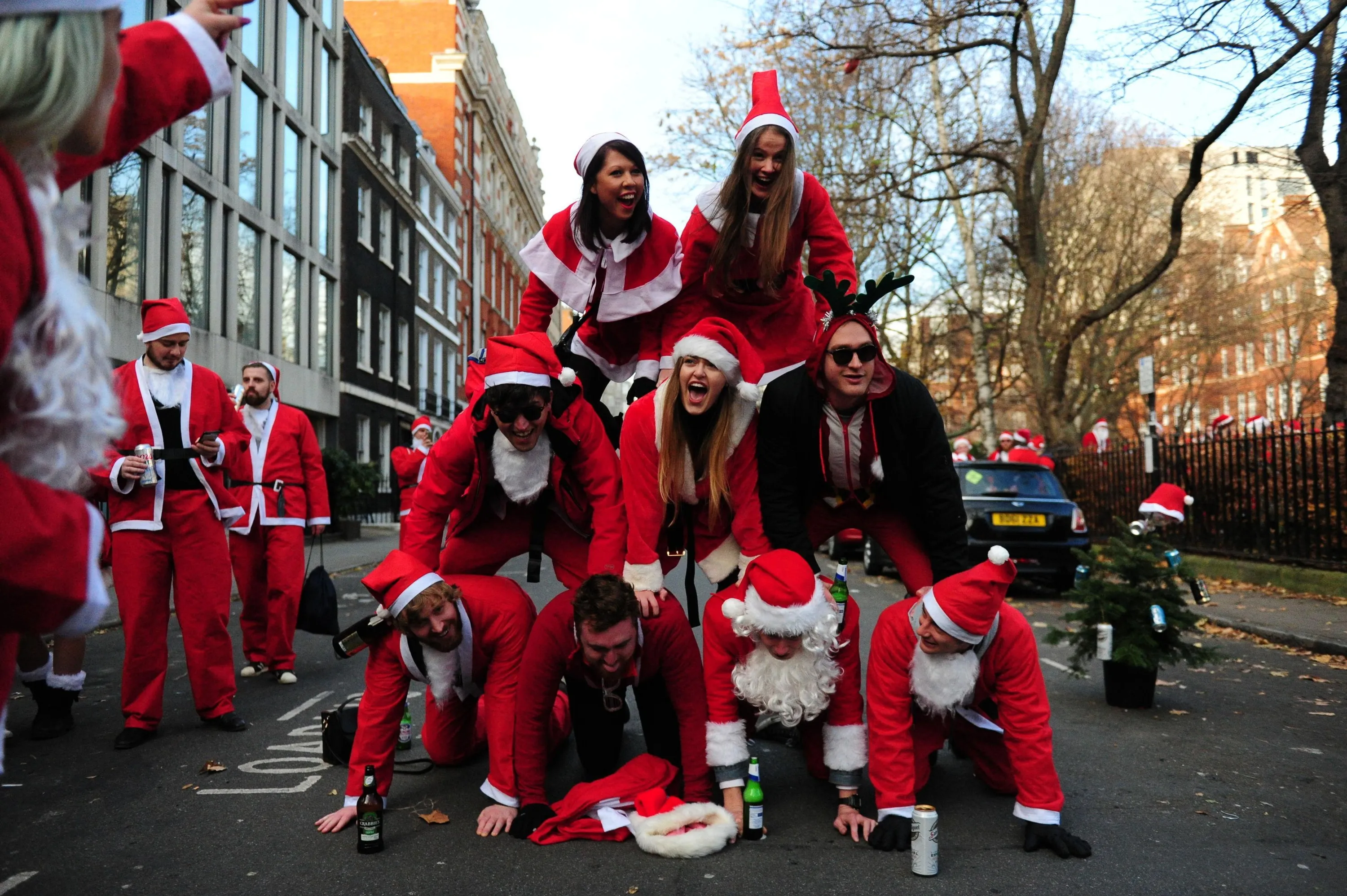 These Santas strike a pose in the middle of London during Santacon day in London, England, on December 9, 2017. (Photo by PA Wire)