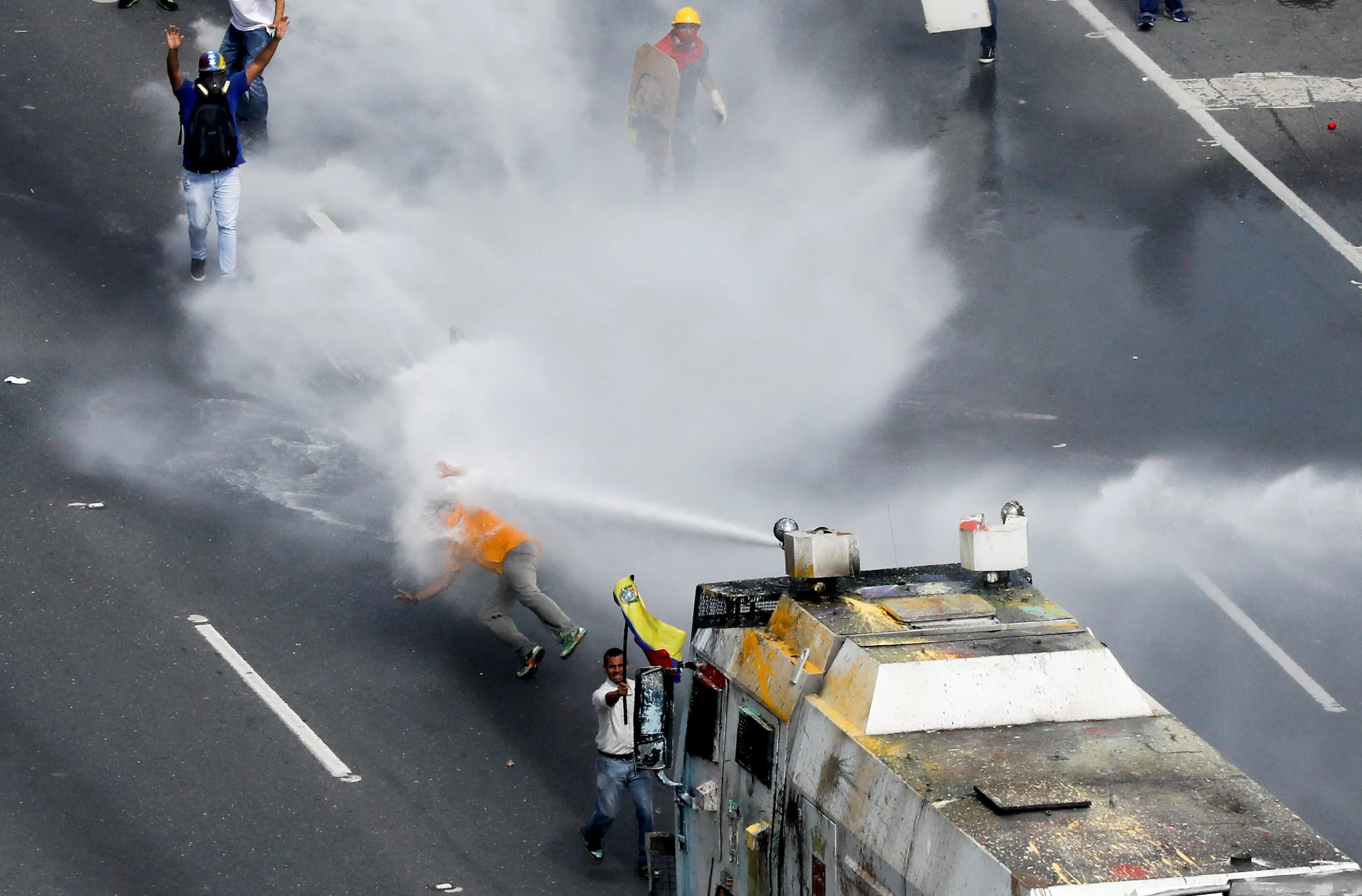 Opposition lawmaker Carlos Paparoni is hit by jets of water during riots at a march to the state ombudsman's office in Caracas, Venezuela, May 29, 2017. A group of young Venezuelan lawmakers has risen to prominence on the violent front line of anti-government marches that have shaken the South American country for three months, bringing 75 deaths. On the streets daily leading demonstrators, pushing at security barricades and sometimes picking up teargas canisters to hurl back at police and soldiers, the energetic National Assembly members are heroes to many opposition supporters. Carlos Garcia Rawlins: “I remember clearly how instants after I spotted Paparoni standing in front of “The Whale”, the common name of the water cannon armoured cars, he was flying through the air due to the unstoppable power of the water, as if he was a feather. Fellow protesters had to drag him out of the place, because from where I was, he seemed to have been unconscious”. (Photo by Carlos Garcia Rawlins/Reuters)