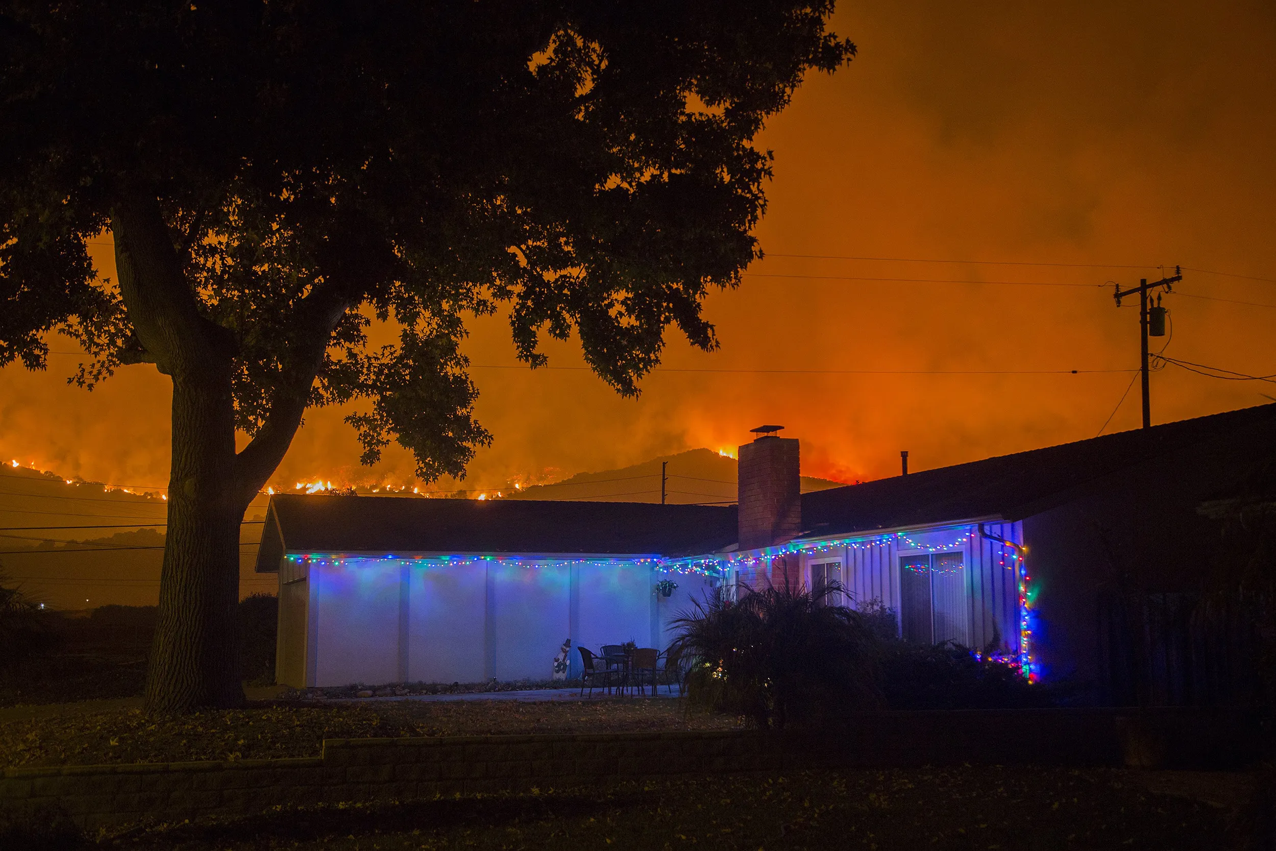 Christmas decorations illuminate a house as the growing Thomas Fire advances toward Santa Barbara County seaside communities on December 10, 2017 in Carpinteria, California. The Thomas Fire has grown to 173,000 acres and destroyed at least 754 structures so far. Strong Santa Ana winds have been feeding major wildfires all week, destroying houses and forcing tens of thousands of people to evacuate. (Photo by David McNew/Getty Images)