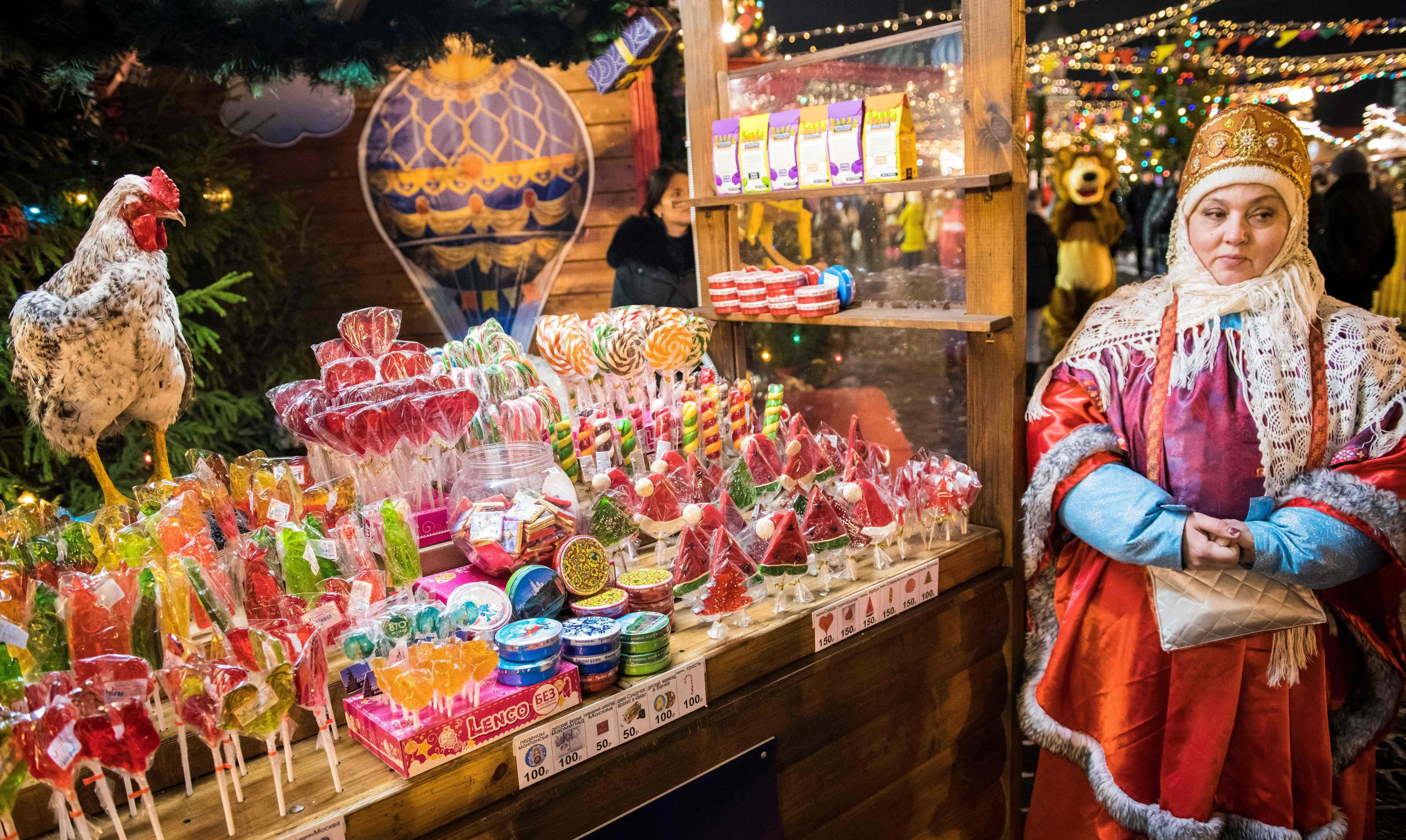 A vendor wearing a traditional dress sells sweets at a Christmas market in Red Square in Moscow on December 4, 2017. (Photo by Mladen Antonov/AFP Photo)