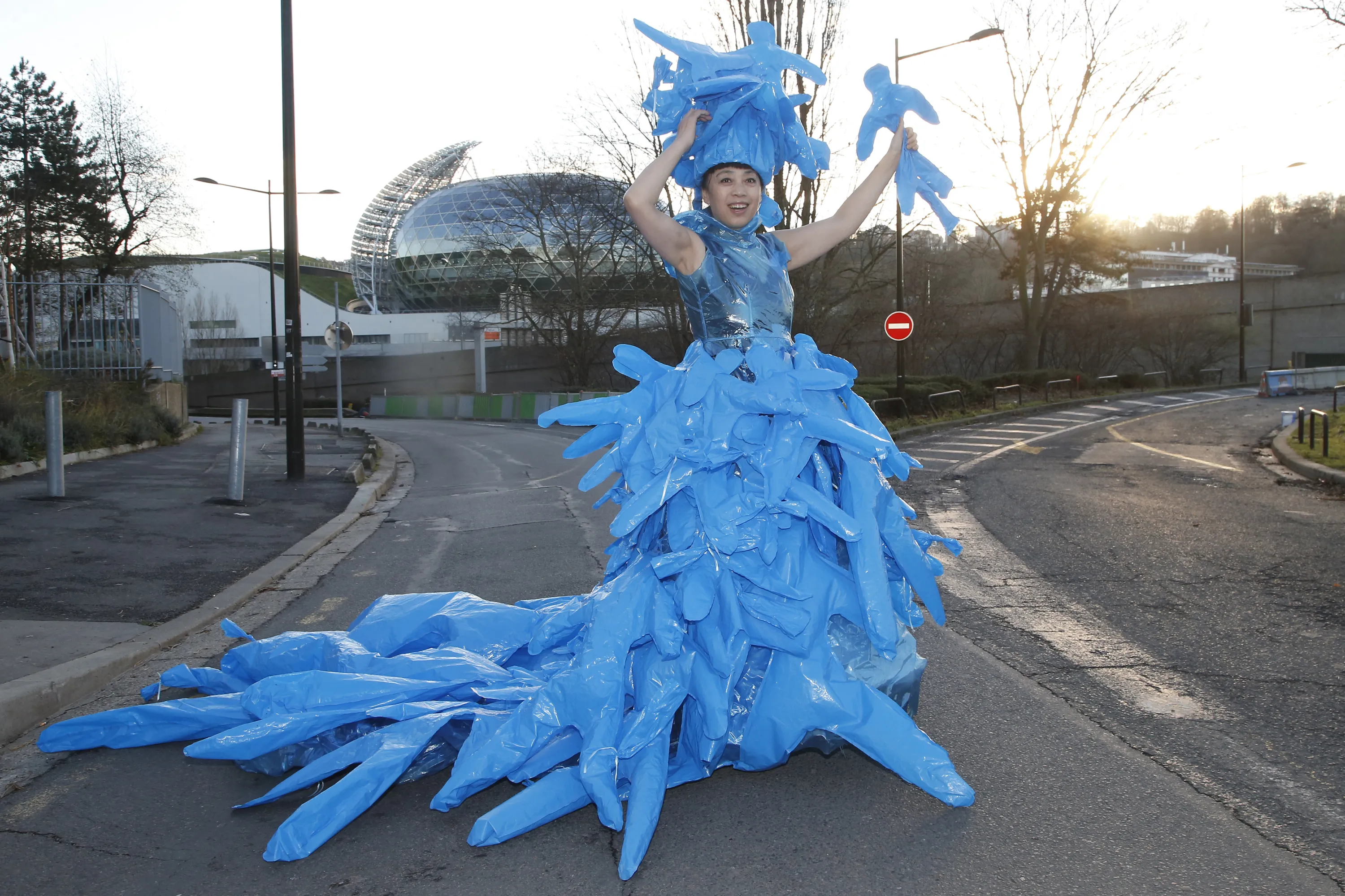 Chinese artist and environmental activist Kong Ning unveils her latest creation in support of the One Planet Summit, in Boulogne-Billancourt near Paris, France, Tuesday, December 12, 2017. More than 50 world leaders are gathering in Paris for a summit that President Emmanuel Macron hopes gives new momentum to the fight against global warming despite U.S. President Donald Trump's rejection of the Paris climate accord. (Photo by Michel Euler/AP Photo)