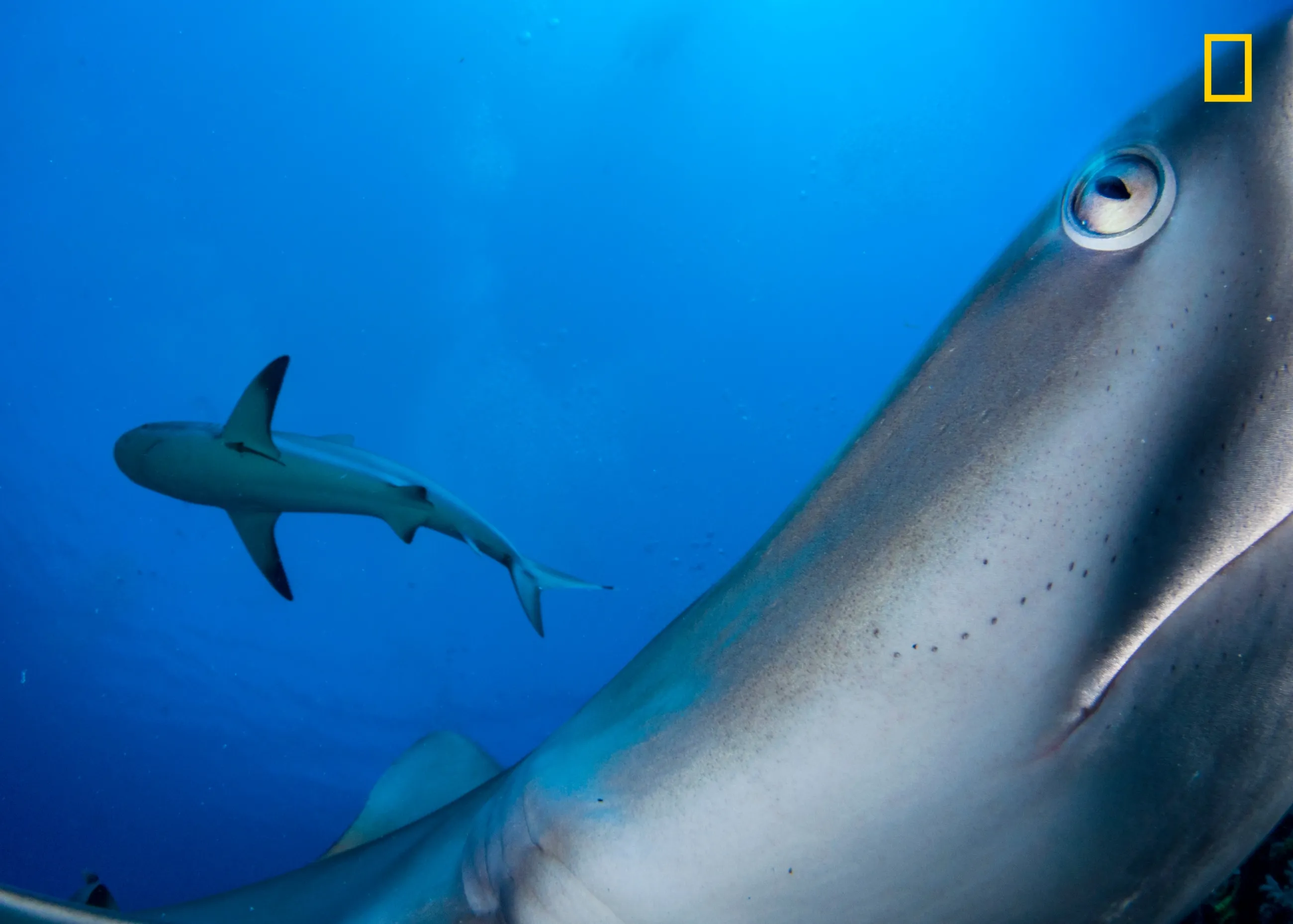 2nd Place in Underwater: Typically a shy species, a Caribbean reef shark investigates a remote-triggered camera in Cuba's Gardens of the Queen marine protected area. (Photo by Shane Gross/National Geographic Nature Photographer of the Year contest 2017)