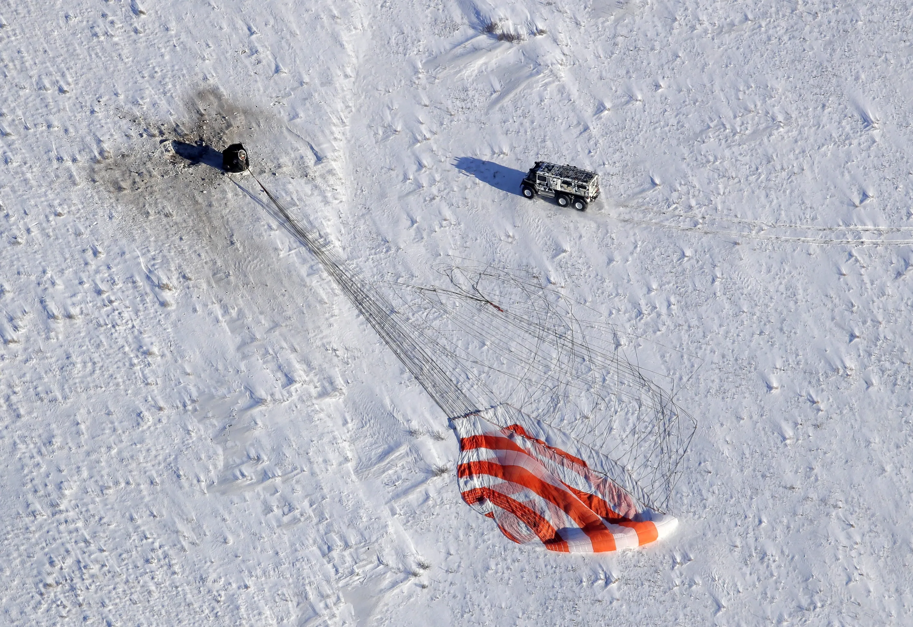 The Russian Soyuz MS-05 space capsule lands about 150 km (90 miles) south-east of the Kazakh town of Zhezkazgan, Kazakhstan, Thursday, December 14, 2017. Three astronauts on Thursday landed back on Earth after nearly six months aboard the International Space Station. (Photo by Dmitri Lovetsky/AP Photo)