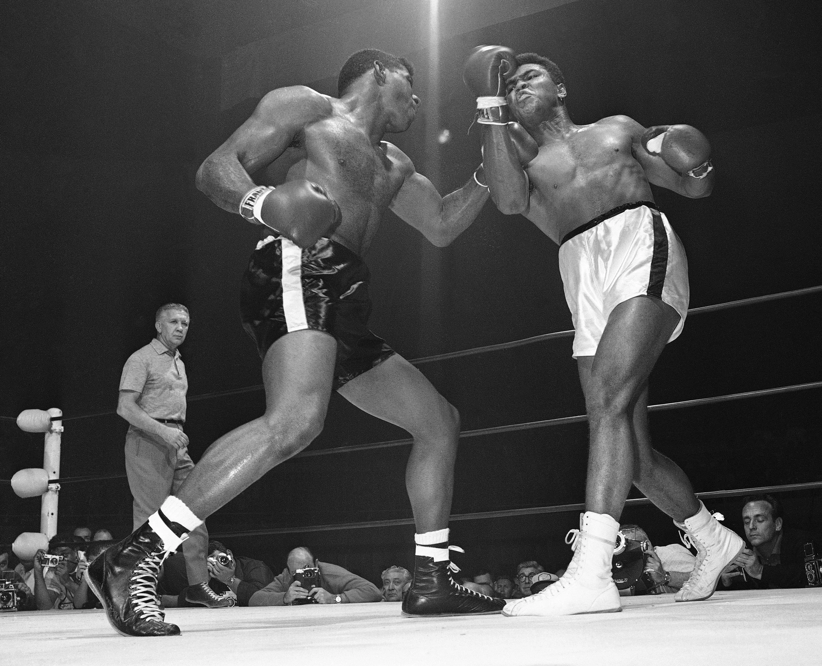 In this November 22, 1965, file photo, challenger Floyd Paterson, left, delivers a left hook to the chin of champion Muhammad Ali during the second round of their heavyweight title fight in Las Vegas. Among the questions Jonathan Eig wanted to answer in his upcoming biography of Ali was this: How many punches did Ali take during a career that ended with him devastated by Parkinson's? You'll have to wait until the book comes out to find out, though Ali himself once calculated the figure at 29,000. (Photo by AP Photo)