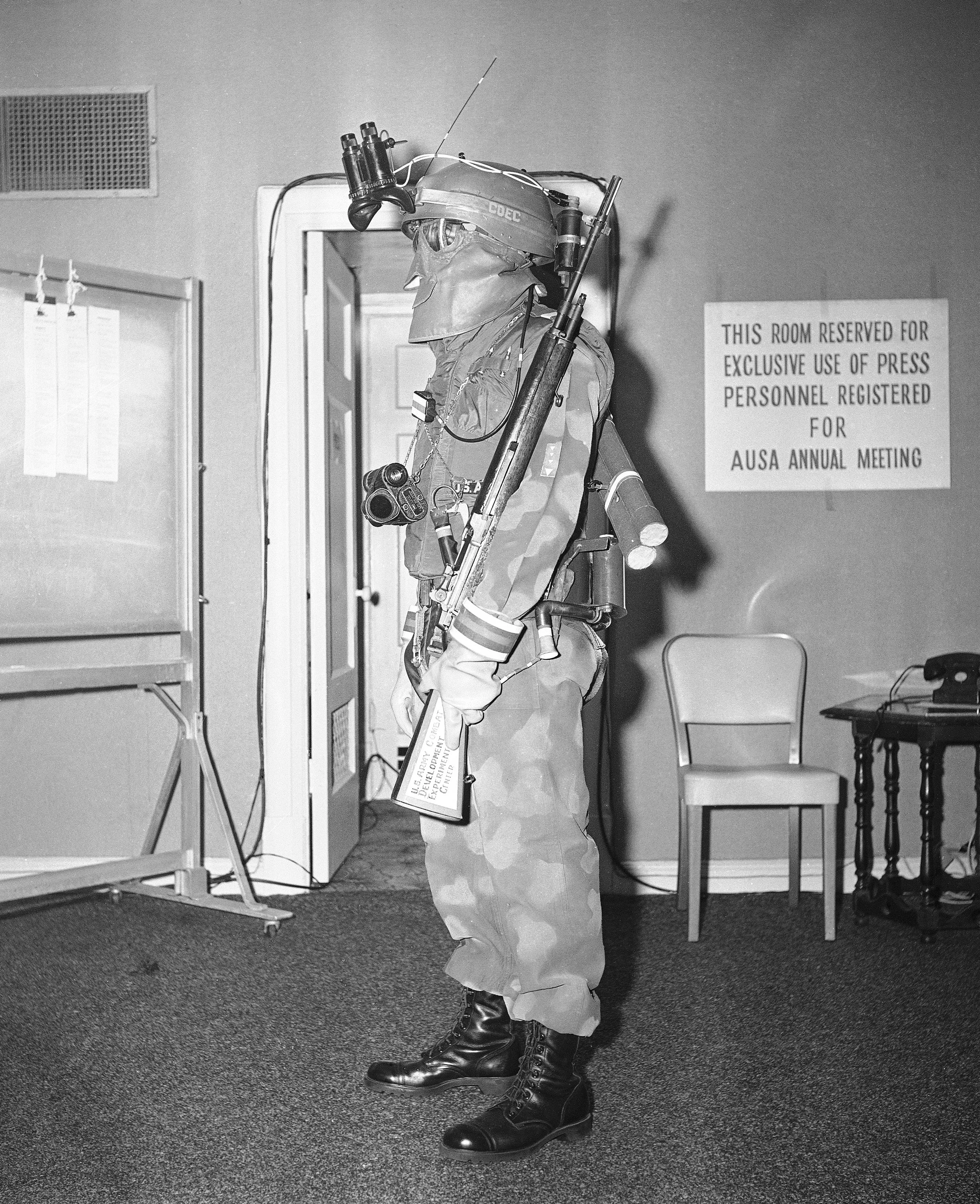 A soldier in Washington on August 3, 1959, models a uniform and equipment for the army of the future. Mask, gloves and other parts of the uniform are designed to give protection against nuclear explosions. The helmet contains a radio receiver. Hooked to the helmet are infra-red binoculars for protection against enemy infra-red detecting devices, an image meta-scope, hang from chain around the neck. On his back the soldier has an explosive fox-hole digger. The rifle is an M-14, which fires a 7.62 millimeter bullet. (Photo by John Rous/AP Photo)
