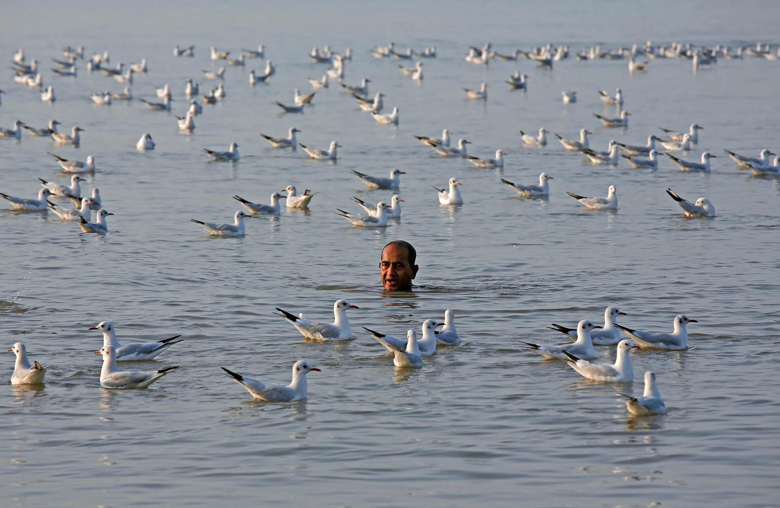 A man swims in the waters of the Arabian Sea amidst a flock of seagulls in Mumbai, December 12, 2017. (Photo by Shailesh Andrade/Reuters)