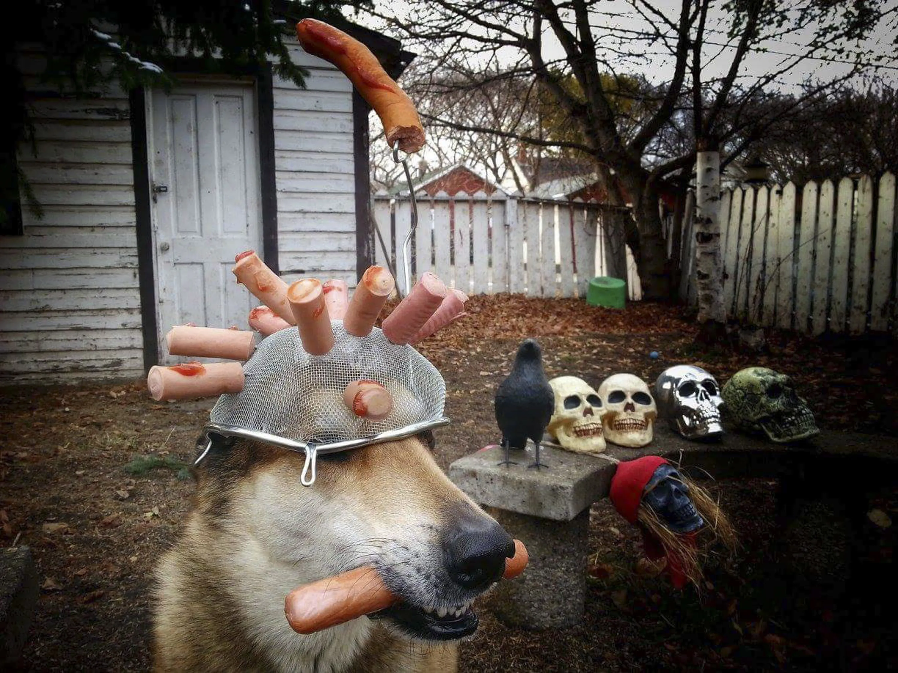 Toby balances halloween decorations on his head. (Photo by Pat Langer/Caters News Agency)