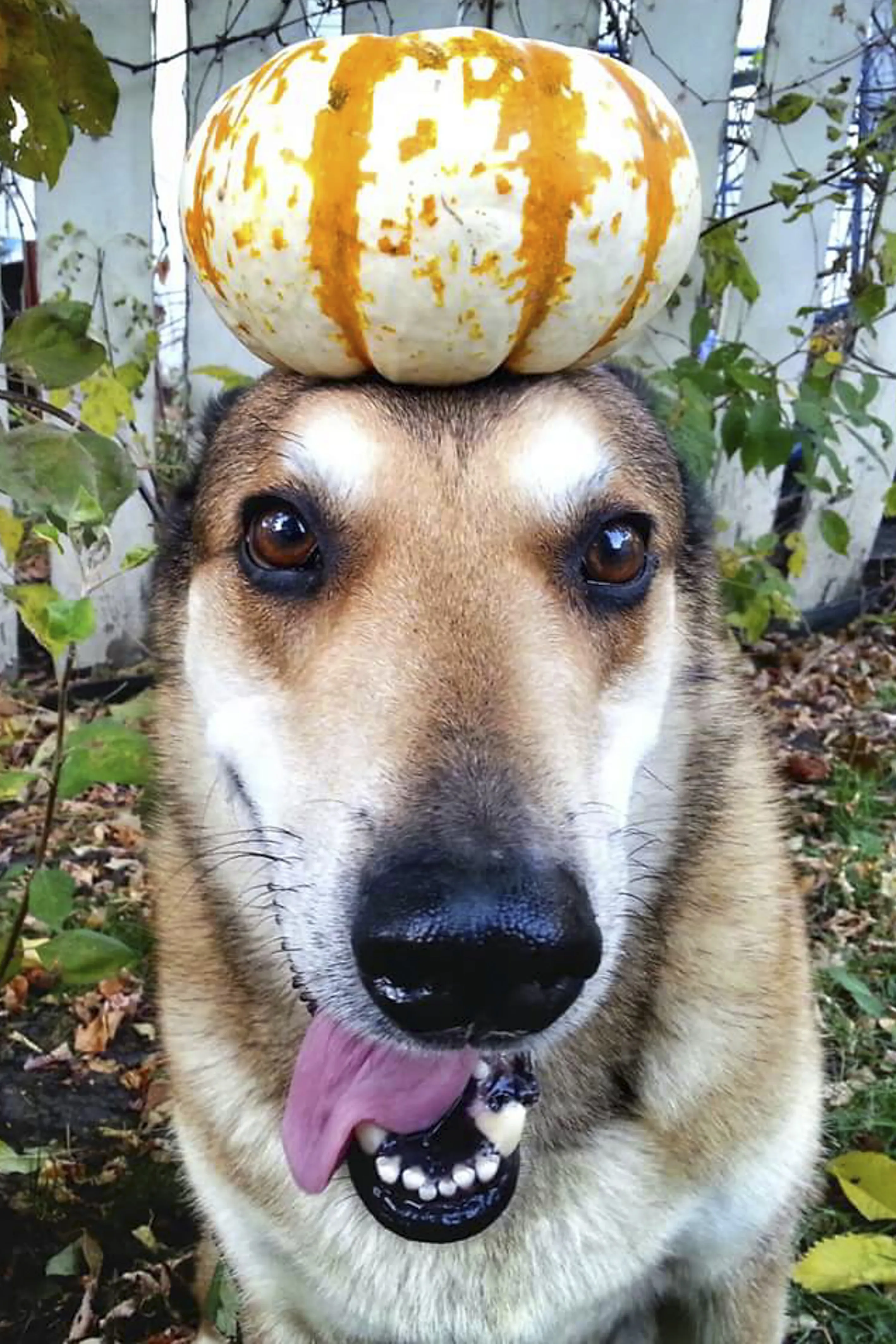 Toby balances a pumpking on his head. (Photo by Pat Langer/Caters News Agency)