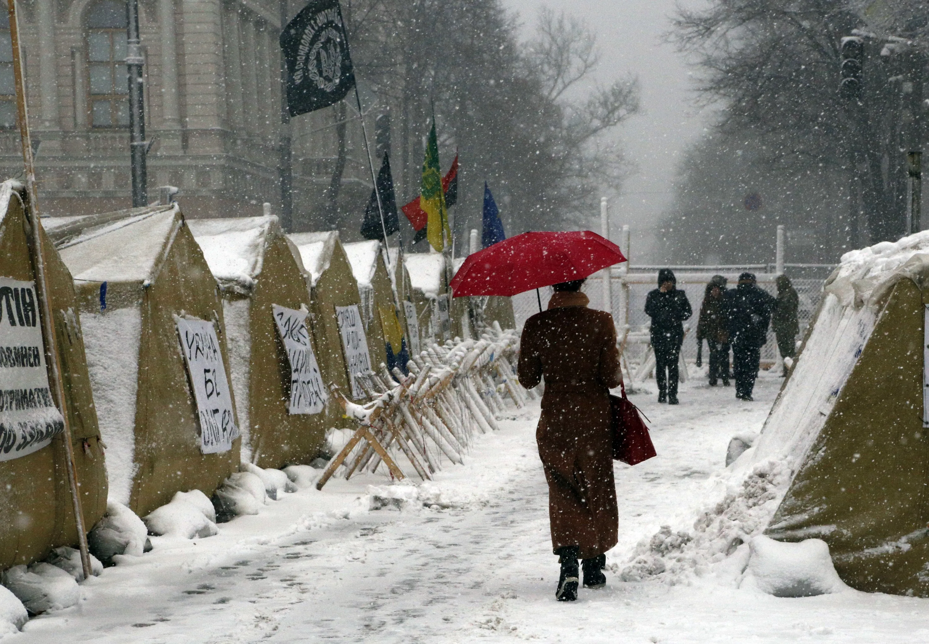 Under heavy snowfall a woman passes by a tent camp placed by supporters of the Movement of New Forces, the political party led by Mikheil Saakashvili in front of the parliament building in Kiev, Ukraine, Monday, December 18, 2017. The streets around Parliament have been the scene of recent protests demanding the resignation of Ukrainian President Petro Poroshenko. (Photo by Efrem Lukatsky/AP Photo)