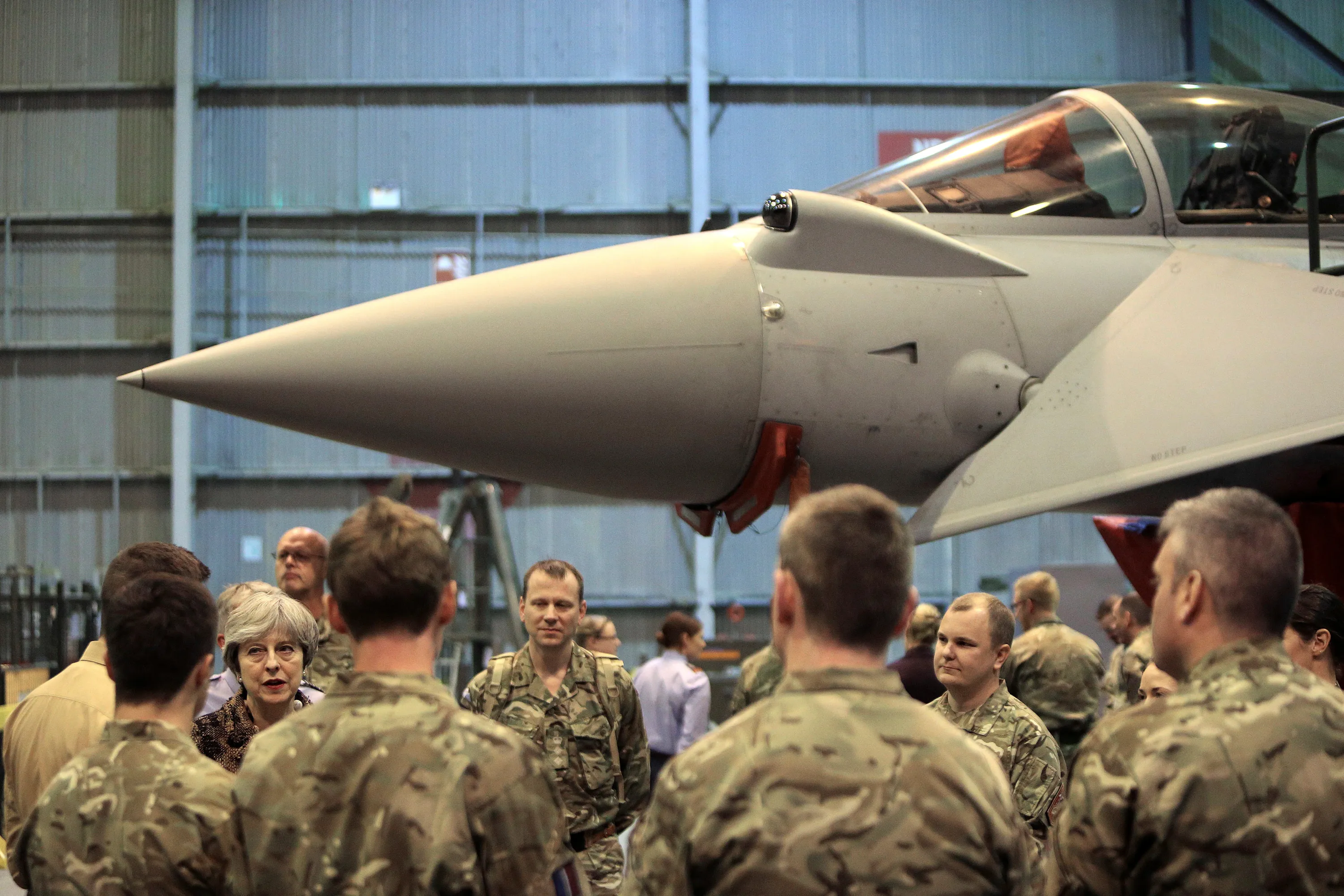 British Prime Minister Theresa May, 2nd left, speaks with troops serving at RAF Akrotiri, one of two military bases Britain maintains on the east Mediterranean island of Cyprus on Thursday, December 21, 2017. (Photo by Petros Karadjias/Reuters)