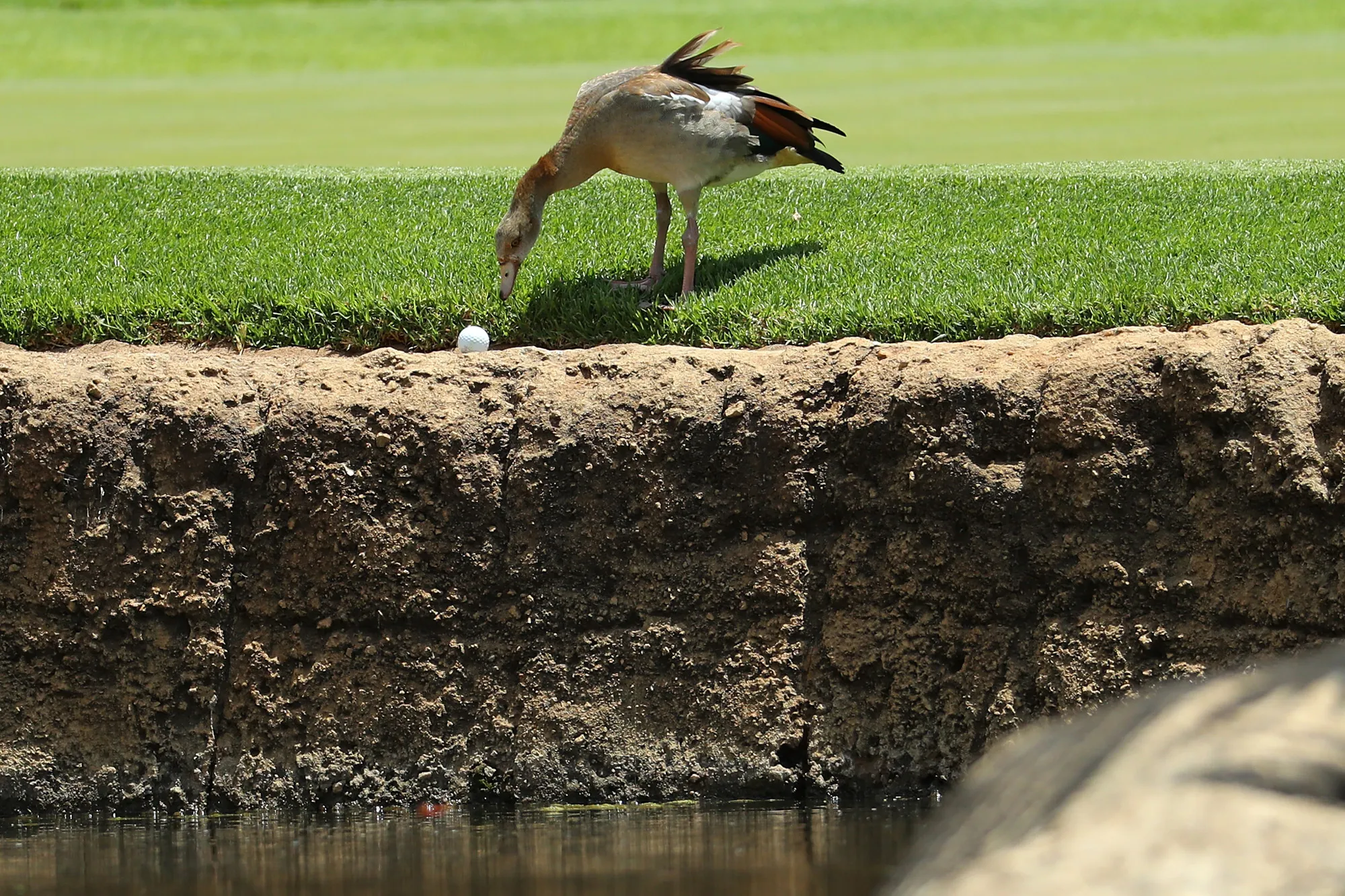 A duck examines the ball of Haydn Porteous of South Africa during the final round of the Nedbank Golf Challenge at Gary Player CC on November 12, 2017 in Sun City, South Africa. (Photo by Warren Little/Getty Images)