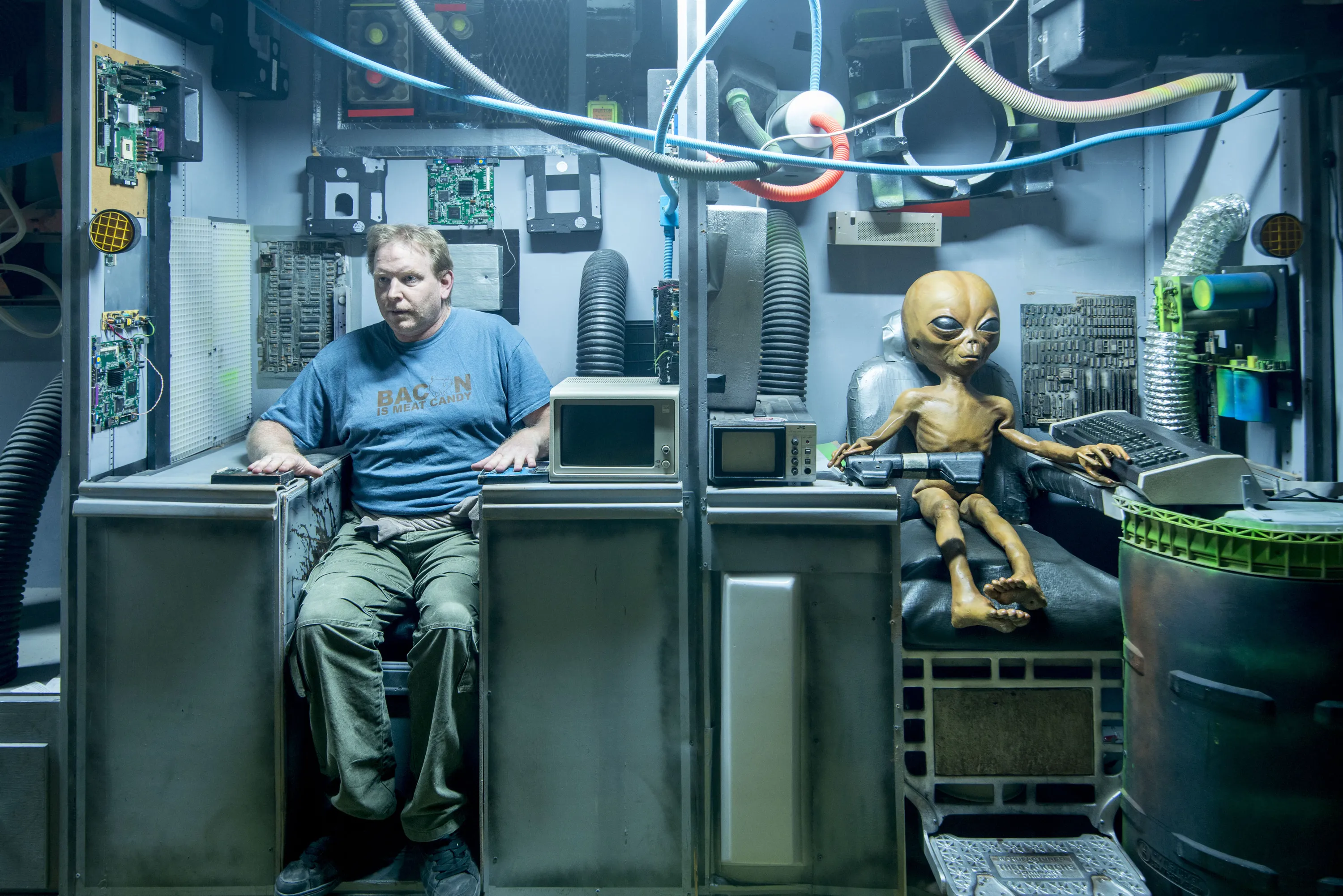 A UFO enthusiast who found himself locked in the iconic Roswell museum has shared the pictures he took with aliens to pass the time. Chris Burton, from the U.K., had dreamed of visiting Roswell, N.M., since he was a child but was stunned when he found himself locked in the International UFO Museum and Research Center during a recent trip. The 42-year-old used the unique opportunity to get interactive with the usually out of bounds exhibits and set up some funny snaps with the extraterrestrials – posing for a beer with one alien and taking a nap with another. Here: Chris has fun with one of the exhibits. (Photo by Chris Burton/Caters News Agency)