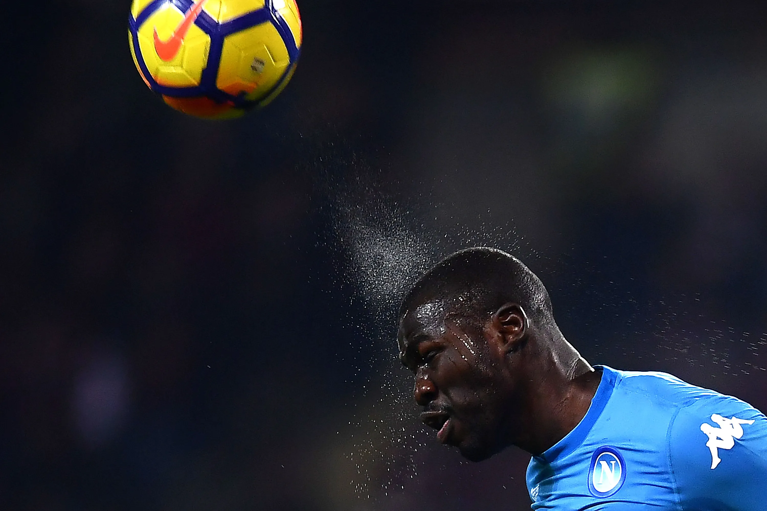Napoli's defender Kalidou Koulibaly from France heads the ball during the Italian Serie A football match Torino Vs Napoli on December 16, 2017 at the “Grande Torino” stadium in Turin. (Photo by Marco Bertorello/AFP Photo)