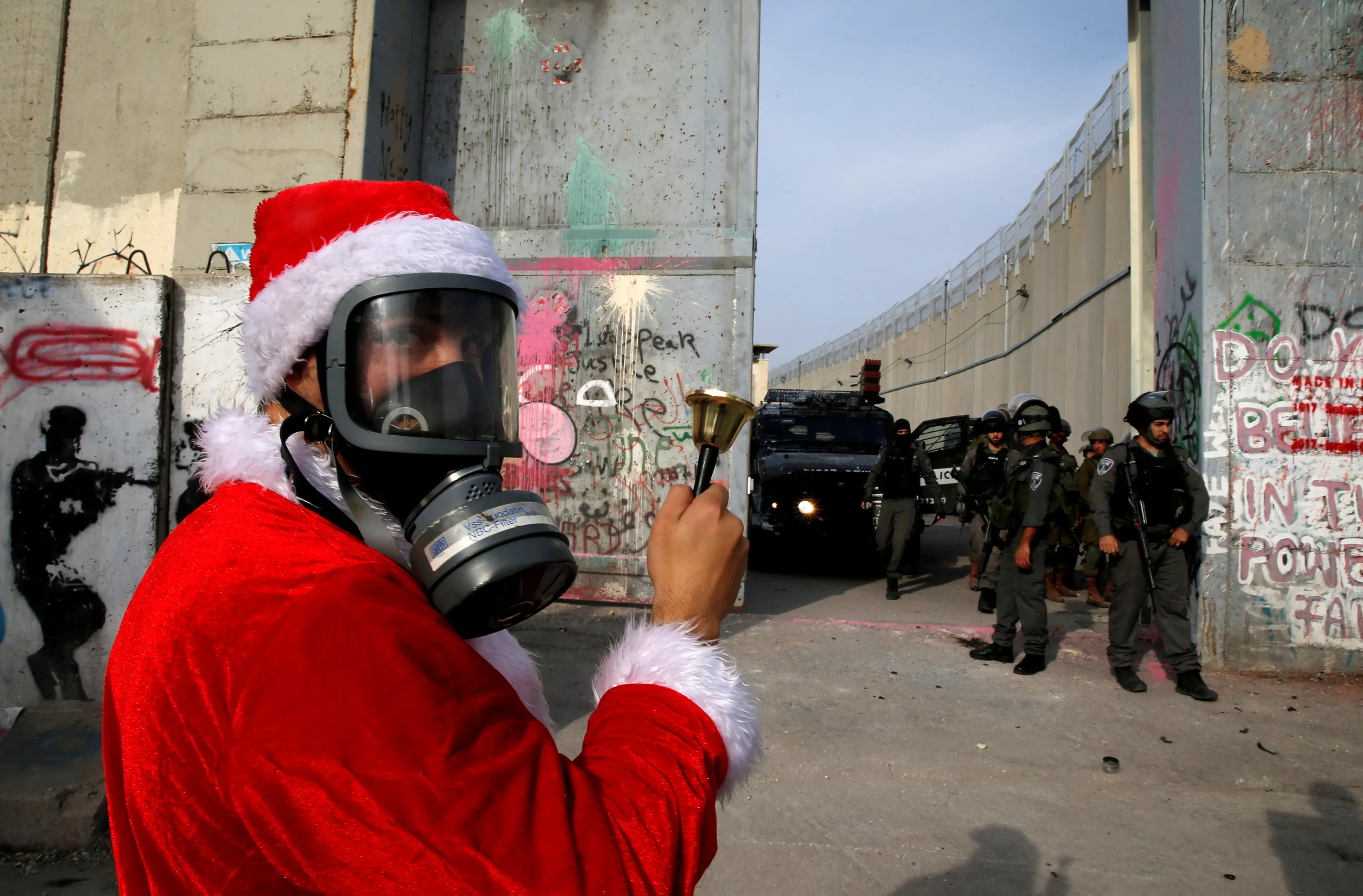 A Palestinian dressed as Santa Claus stands in front of Israeli troops during a protest in the West Bank city of Bethlehem, December 23, 2017. (Photo by Ammar Awad/Reuters)