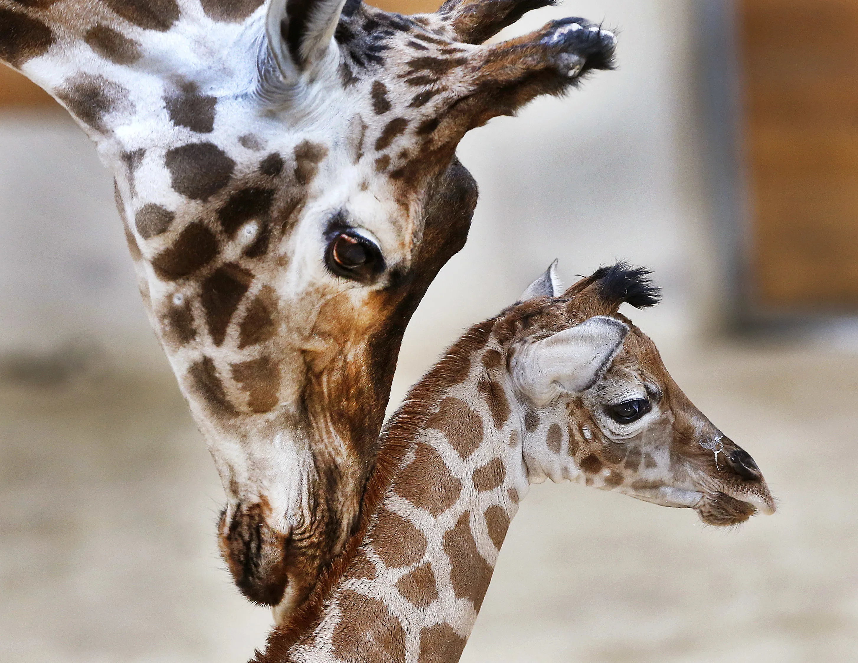 Three-days-old giraffe baby Kimara is touched by its mother Katharina during its first way out in the Opel zoo in Kronberg near Frankfurt, Germany, January 3, 2017. (Photo by Michael Probst/AP Photo)
