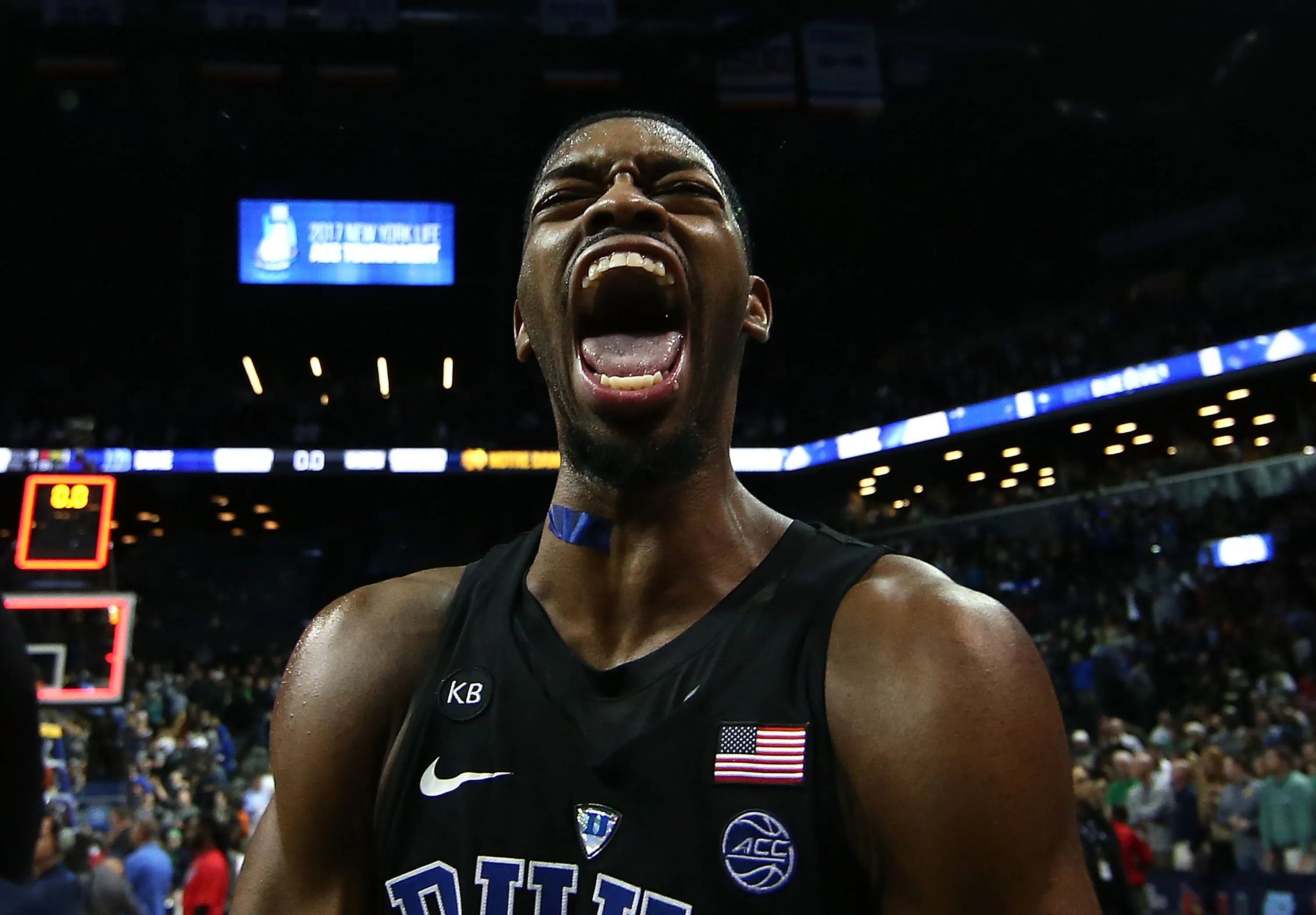 Amile Jefferson #21 of the Duke Blue Devils celebrates their 75-69 win over the Notre Dame Fighting Irish in the championship game of the 2017 Men's ACC Basketball Tournament at the Barclays Center on March 11, 2017 in New York City. (Photo by Al Bello/Getty Images)