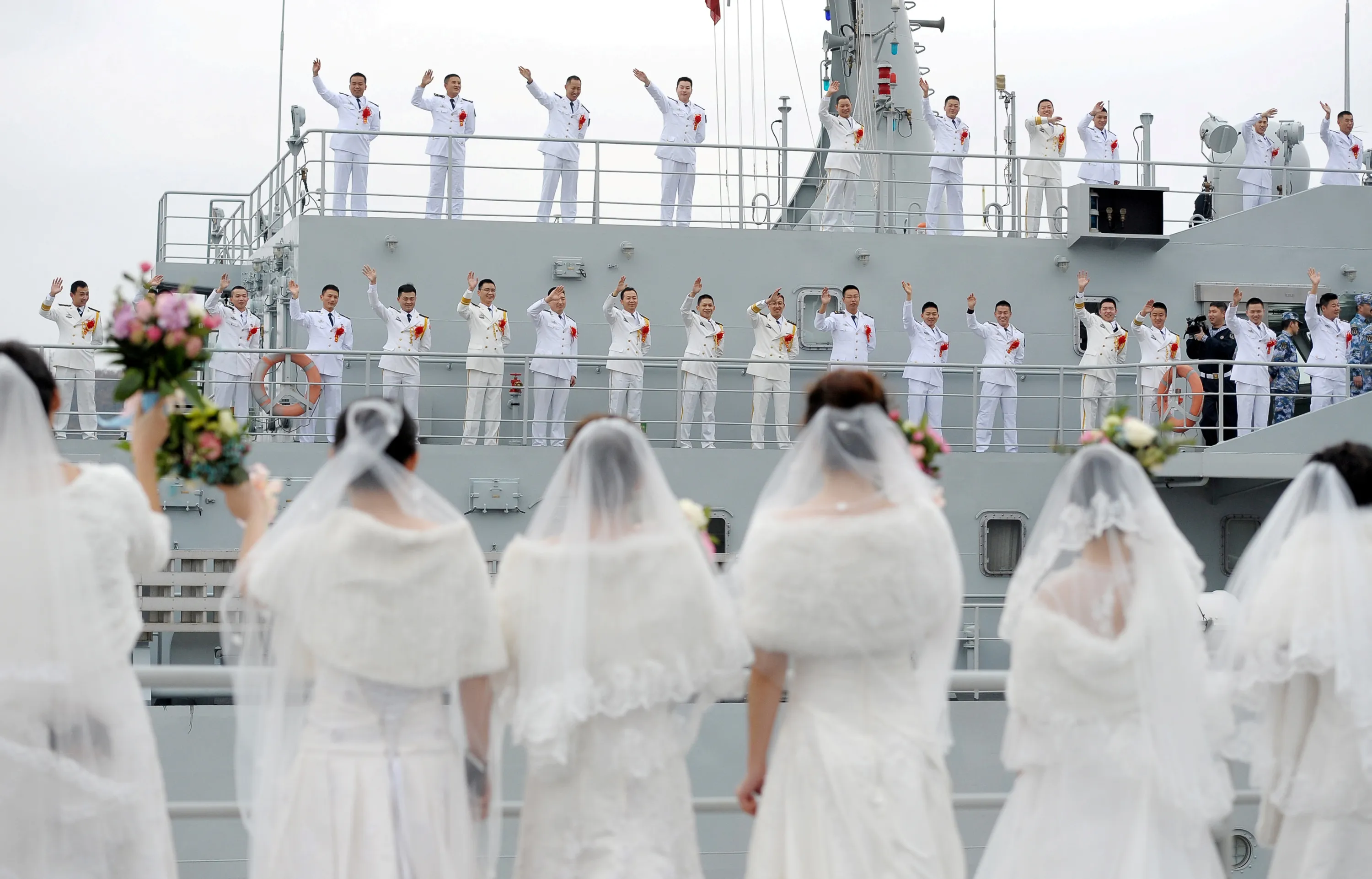 Navy personnel of People's Liberation Army (PLA) wave at their brides during a mass wedding at a military base in Zhoushan, Zhejiang province, China December 29, 2017. (Photo by Reuters/China Stringer Network)