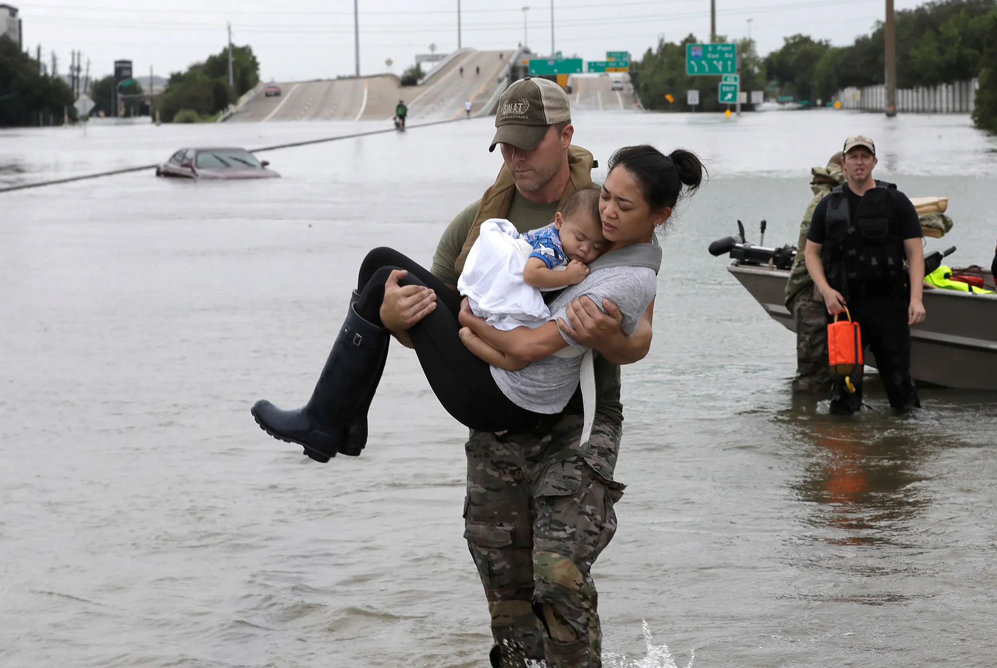 Houston Police SWAT officer Daryl Hudeck carries Catherine Pham and her 13-month-old son Aiden after rescuing them from their home surrounded by floodwaters from Tropical Storm Harvey in Houston on August 27, 2017. (Photo by David J. Phillip/AP Photo)