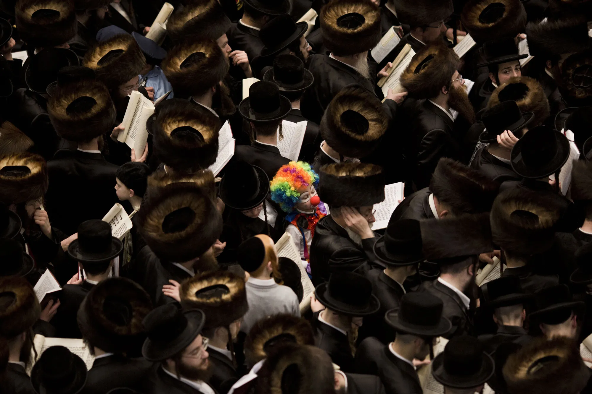 An Ultra-Orthodox Jewish child dressed as a clown (C) stands among men reading from the Book of Esther during a prayer for the Jewish Holiday of Purim in the Mea Shaarim neighborhood in Jerusalem, Israel, 12 March 2017.The joyful Jewish holiday of Purim celebrates the Jews' salvation from genocide in ancient Persia, as recounted in the Scroll of Esther. (Photo by Abir Sultan/EPA/EFE)