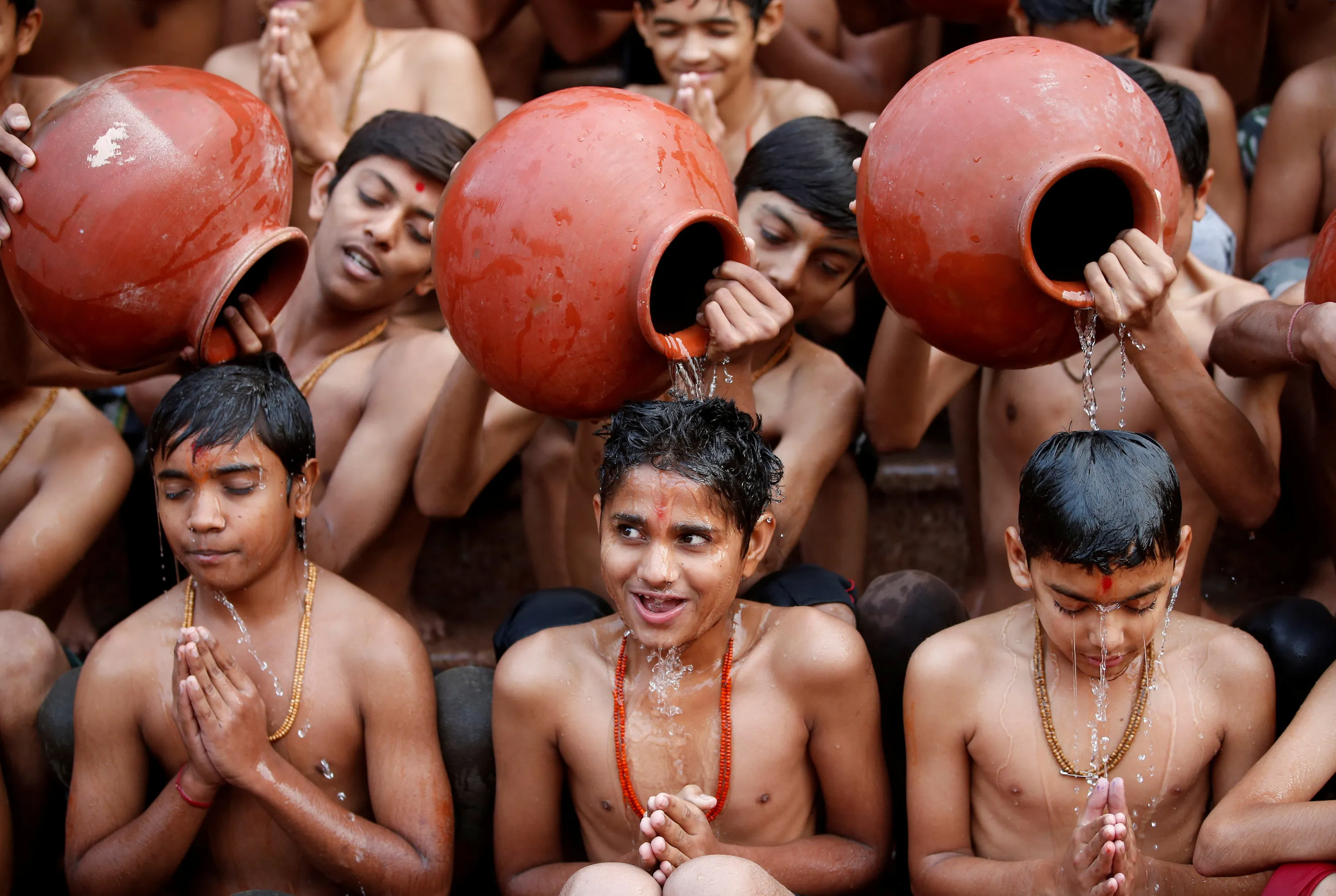 Students react as water from earthen pitchers is poured on them to take a holy bath during a ceremony organised to resemble the annual month-long Hindu religious festival of Magh Mela, held during the Hindu month of Magh, in Ahmedabad, India, January 1, 2018. (Photo by Amit Dave/Reuters)