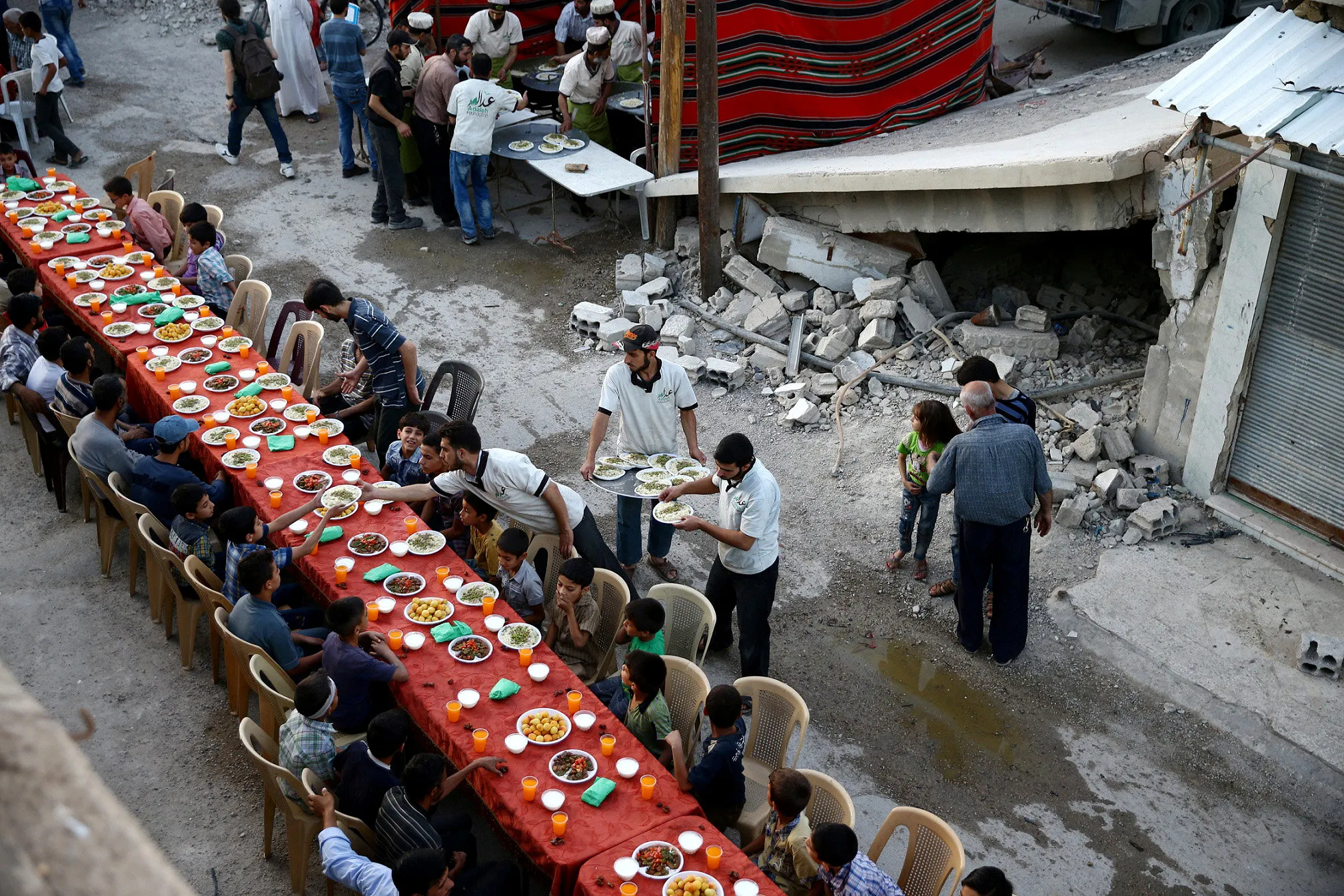 People gather for Iftar (breaking fast), organised by Adaleh Foundation, amidst damaged buildings during the holy month of Ramadan in the rebel-held besieged town of Douma to the east of Damascus, Syria, June 18, 2017. (Photo by Bassam Khabieh/Reuters)