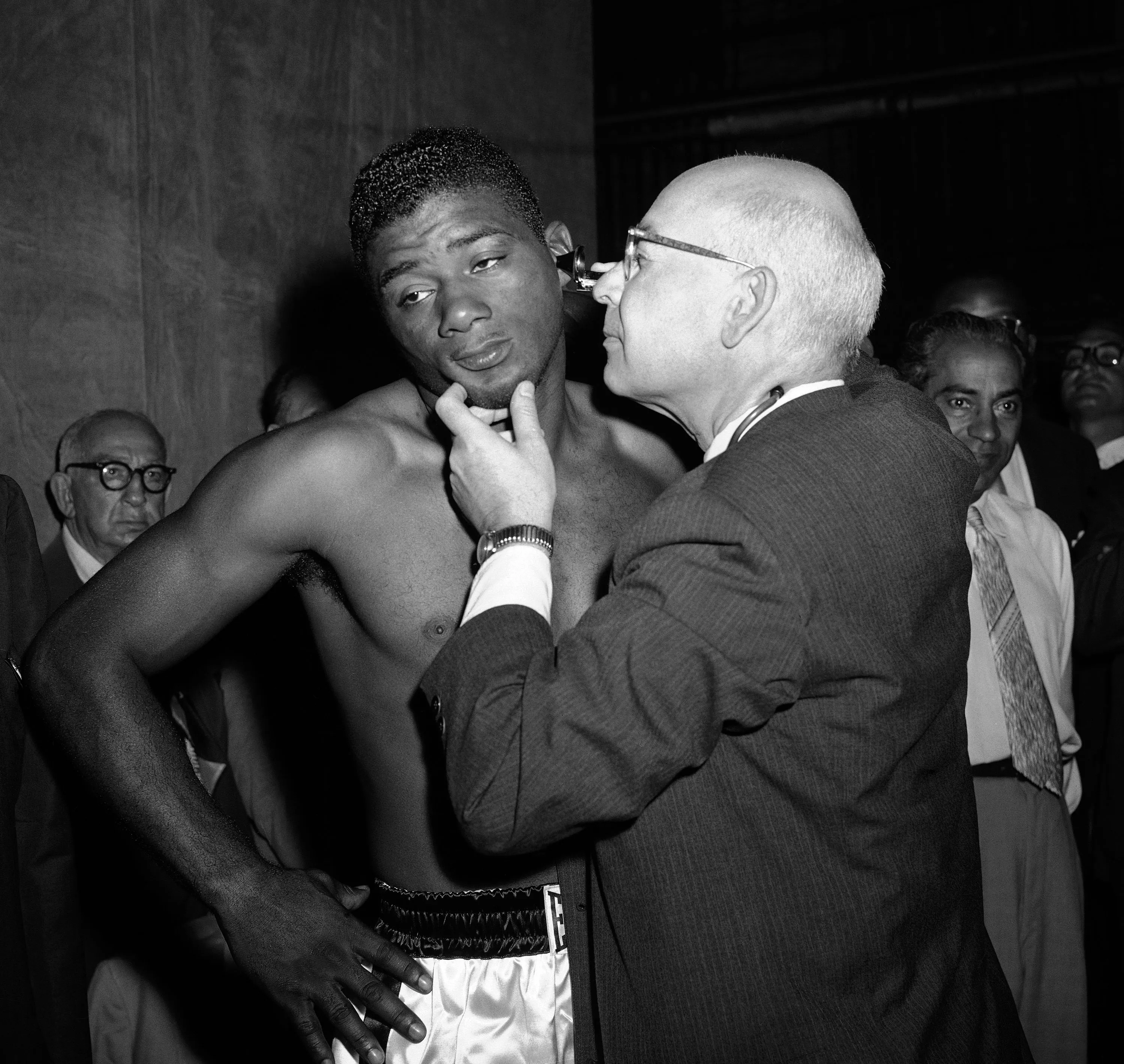 Heavyweight champion Floyd Patterson, and challenger, Tommy (Hurricane) Jackson, can hold no secrets from doctors examining them before their title bout later in the day at New York�s Polo Grounds on July 29, 1957. At the examining room in winter garden theatre, a doctor checks Patterson's ear. Jackson, having his temperature checked, shushes a bystander. (Photo by Anthony Camerano/AP Photo)