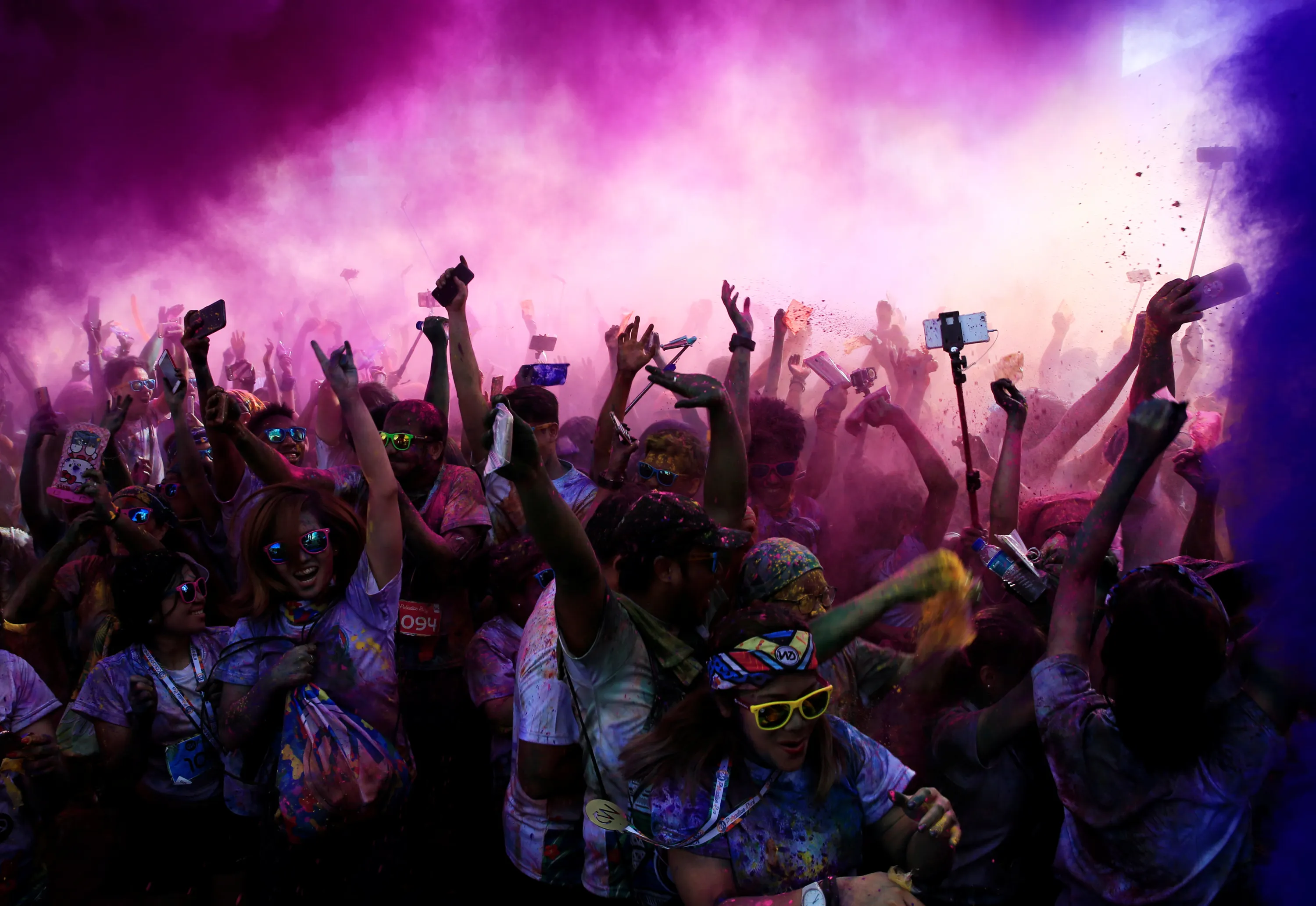 Colored powder is sprayed on runners as they celebrate during a “Color Fun Run” in Pasay city, Metro Manila, Philippines January 7, 2018. (Photo by Romeo Ranoco/Reuters)