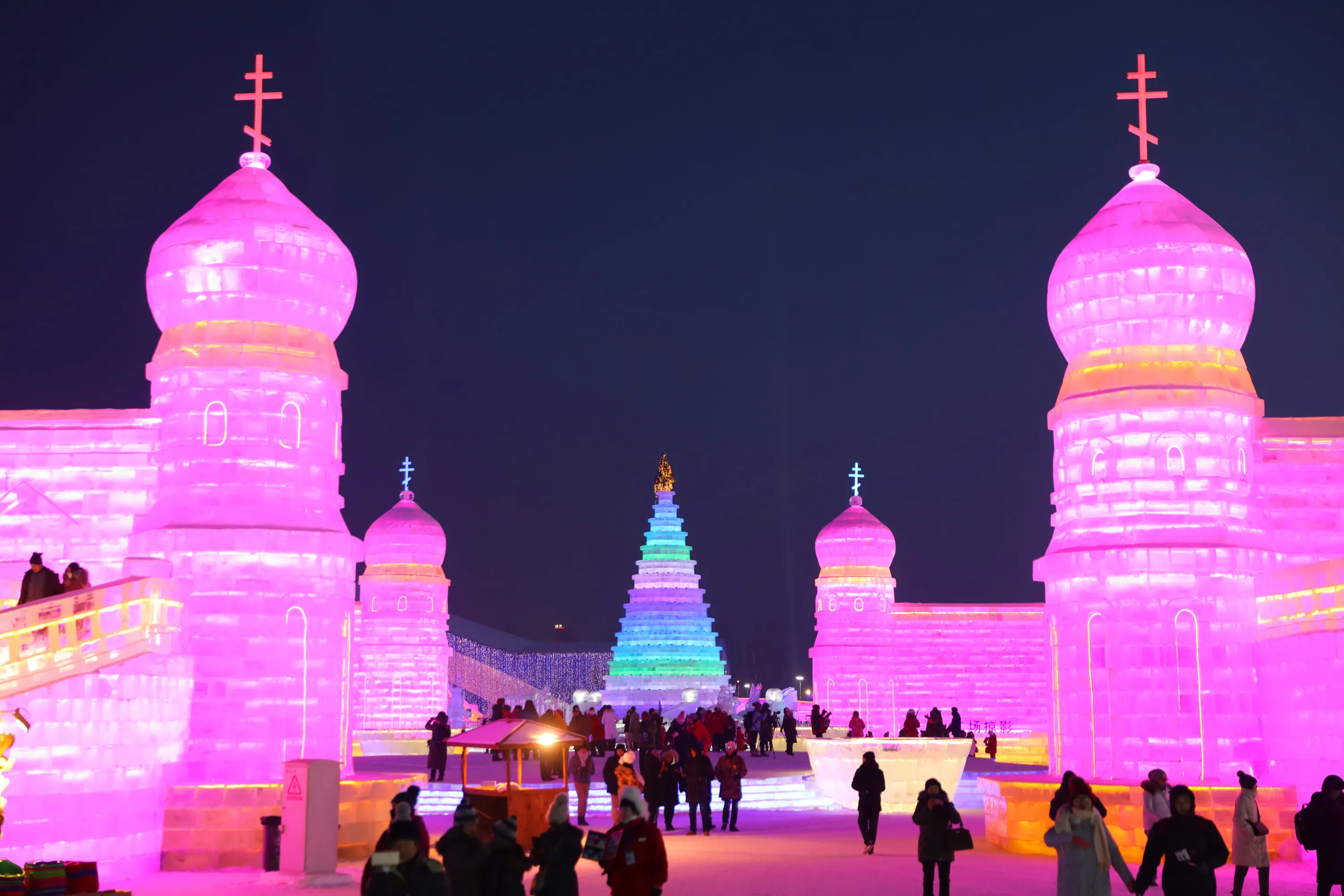People visit the ice sculptures illuminated by coloured lights at Harbin ice and snow world for the 34th Harbin International Ice and Snow Festival in Harbin city, China's northern Heilongjiang province, January 4, 2018. (Photo by Wu Hong/EPA/EFE/Rex Features/Shutterstock)