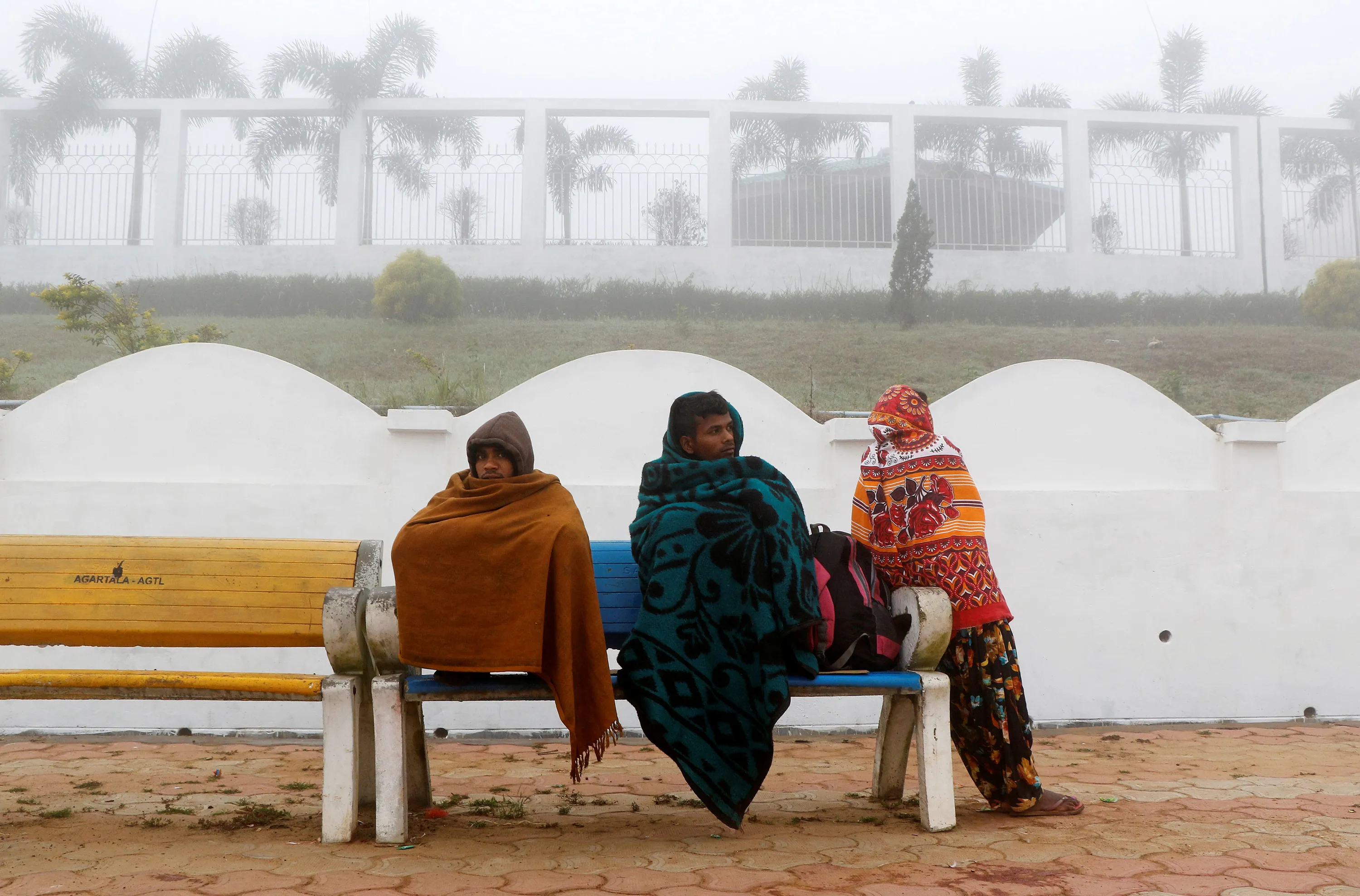 People wrap themselves in blankets and shawls as they wait for trains at a railway station on a foggy winter morning on the outskirts of Agartala, India, January 6, 2018. (Photo by Jayanta Dey/Reuters)
