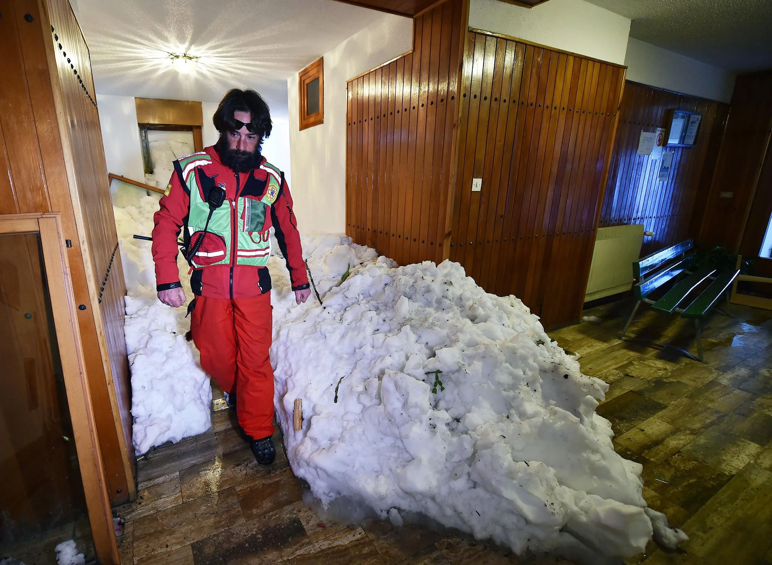 A paramedic inspects an apartment building covered with snow after Snow an avalanche hit in the Alpine town of Sestriere, near Turin, Italy, 09 January 2018. The authorities have evacuated 69 people, including several children, who have been put up in hotels, with the local council footing the bill. The building has been declared unfit for access. In addition, in the same town on 09 January roughly 100 people were evacuated from the Olympic Village built for the 2006 Winter games. Authorities have issued a high avalanche alert due to heavy snowfalls in northern Italy. (Photo by Alessandro Di Marco/EPA/EFE)