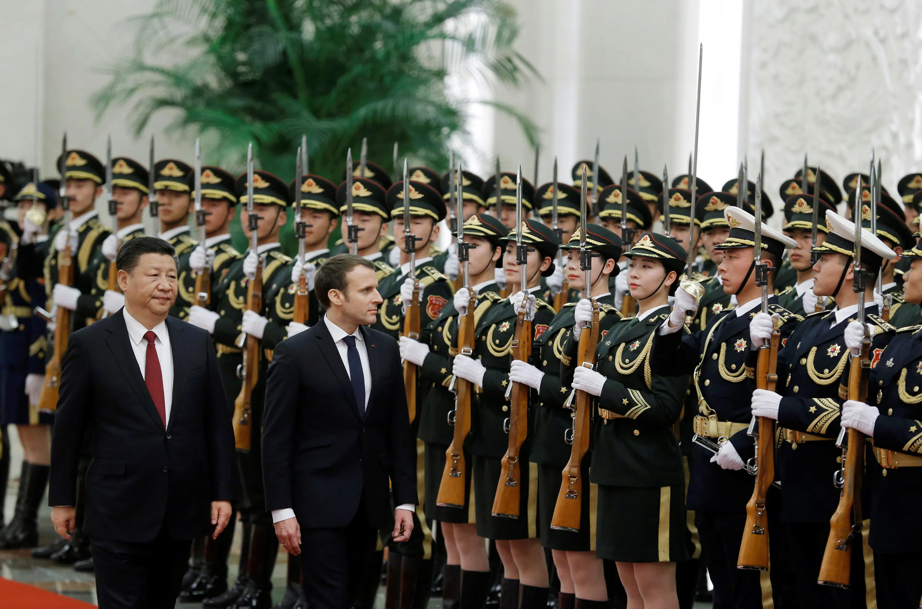 French President Emmanuel Macron and Chinese President Xi Jinping review the guard of honour during a welcoming ceremony at the Great Hall of the People in Beijing, China January 9, 2018. (Photo by Thomas Peter/Reuters)