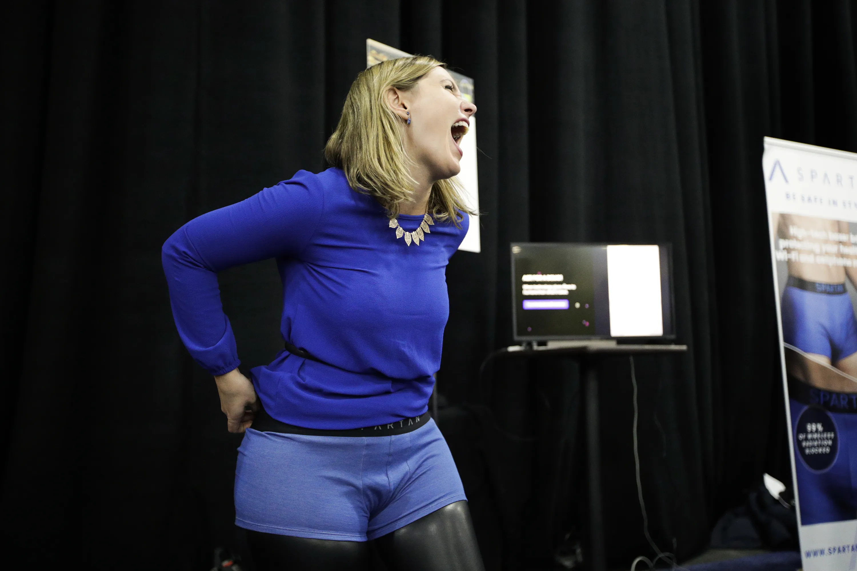 Mariana Marcaletti laughs as she tries on a Spartan boxer, an underwear that blocks radiation from wireless devices, during CES Unveiled at CES International Sunday, January 7, 2018, in Las Vegas. (Photo by Jae C. Hong/AP Photo)