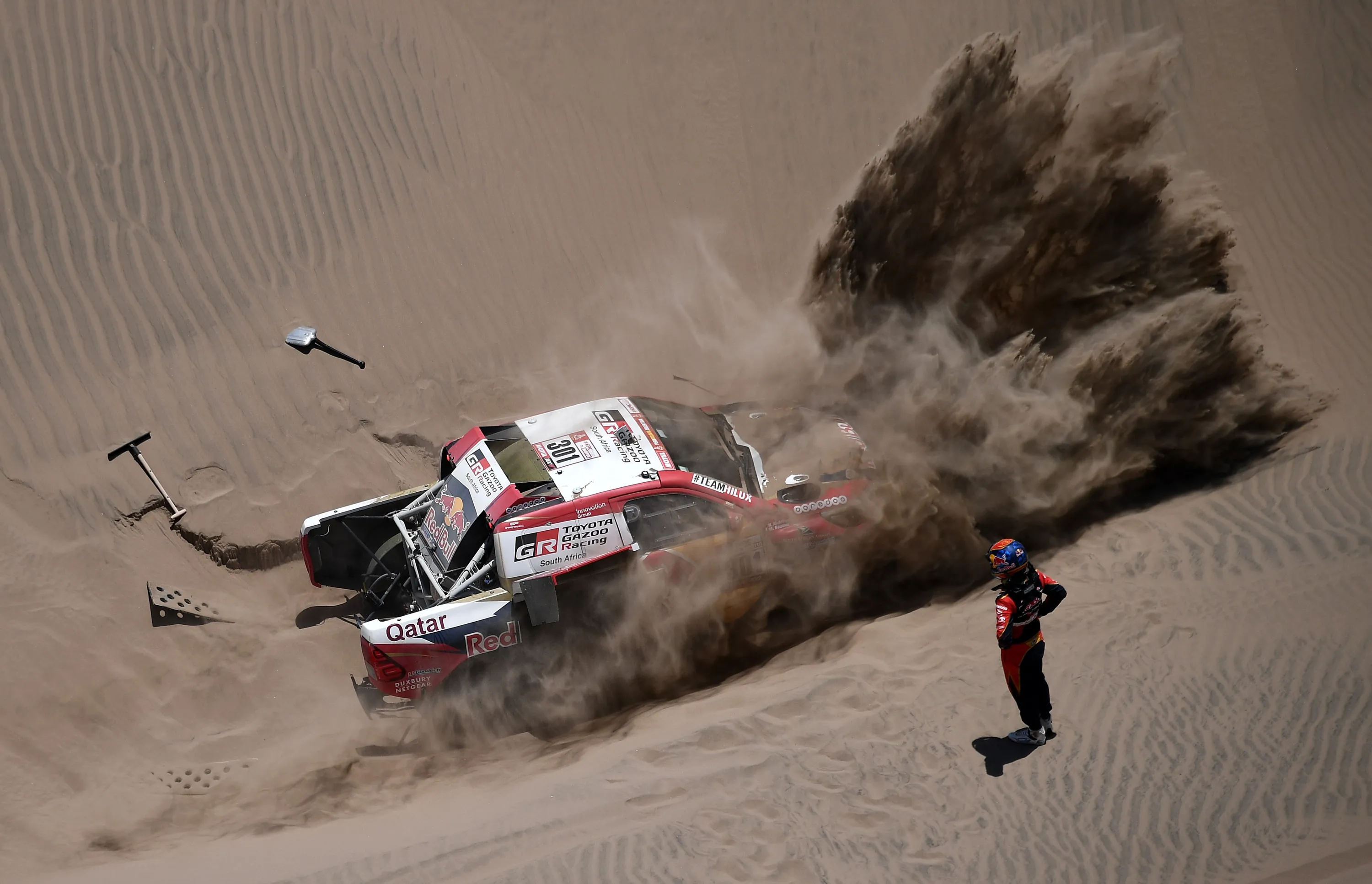 Toyota's driver Nasser Al-Attiyah of Qatar and his co-driver Matthieu Baumel of France get stuck in the sand dunes during Stage 4 of the Dakar 2018, in and around San Juan De Marcona, Peru, on January 9, 2018. (Photo by Franck Fife/AFP Photo)