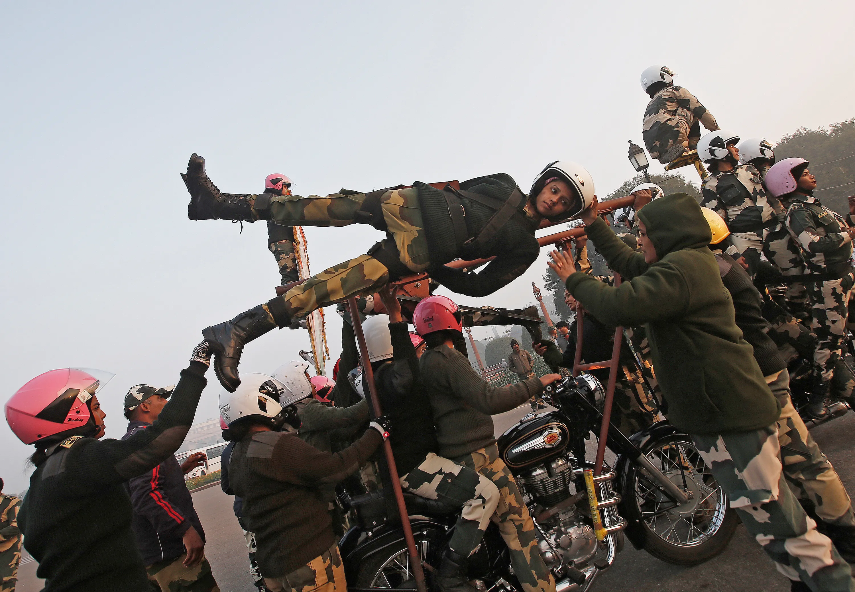 India's Border Security Force (BSF) “Daredevils” women motorcycle riders help their colleague to balance on a bike during a rehearsal for the Republic Day parade on a cold winter morning in New Delhi, India, January 10, 2018. (Photo by Adnan Abidi/Reuters)