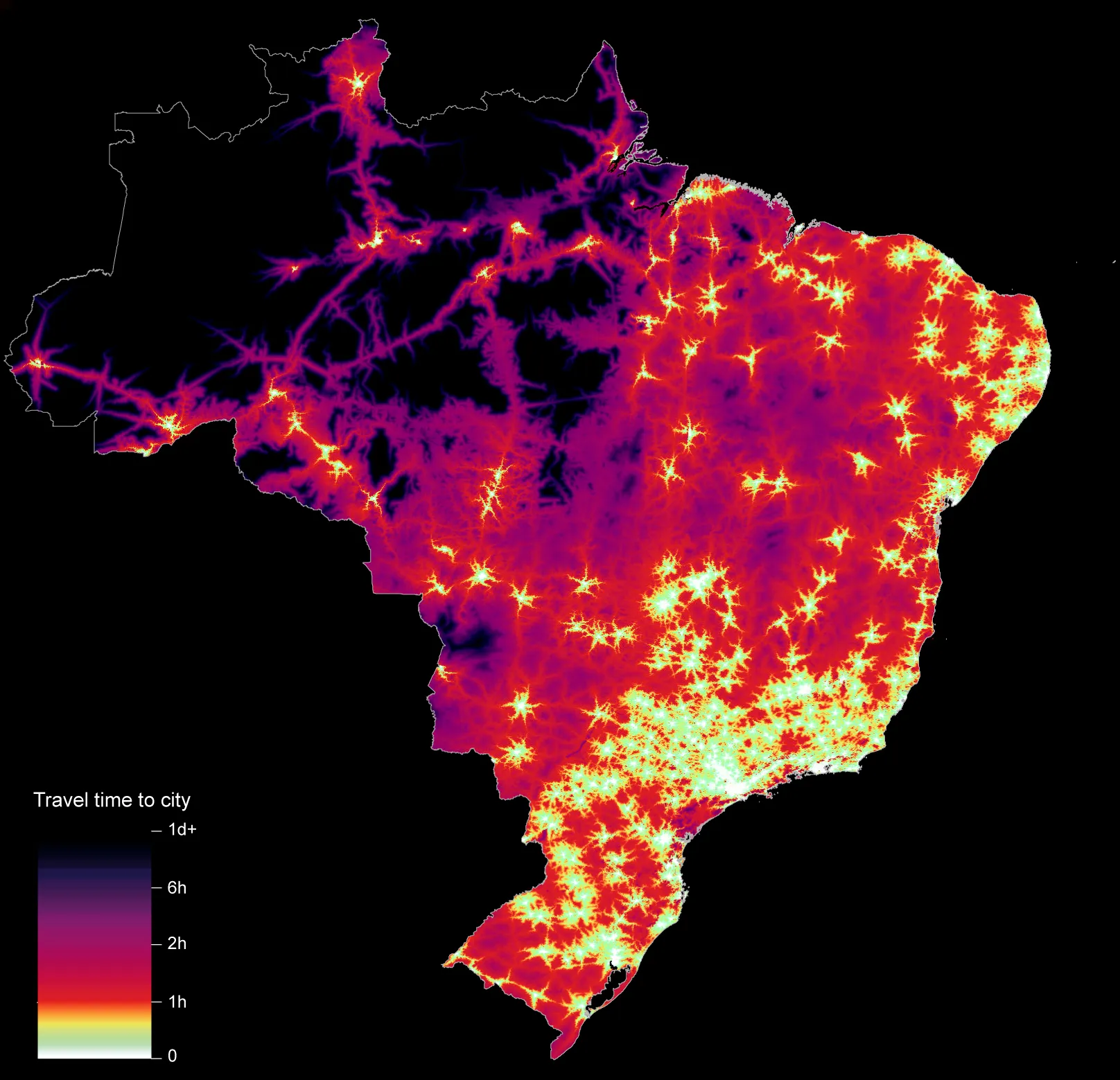 Brazil. The large roads carving through the borders of the Amazon display the correlation between infrastructure and deforestation in Brazil. Proximity to urban centres has a protective effect on forests, as the majority of deforestation occurs one to five hours travel time from cities. (Photo by Daniel Weiss/Jennifer Rozier/Malaria Atlas Project/University of Oxford )